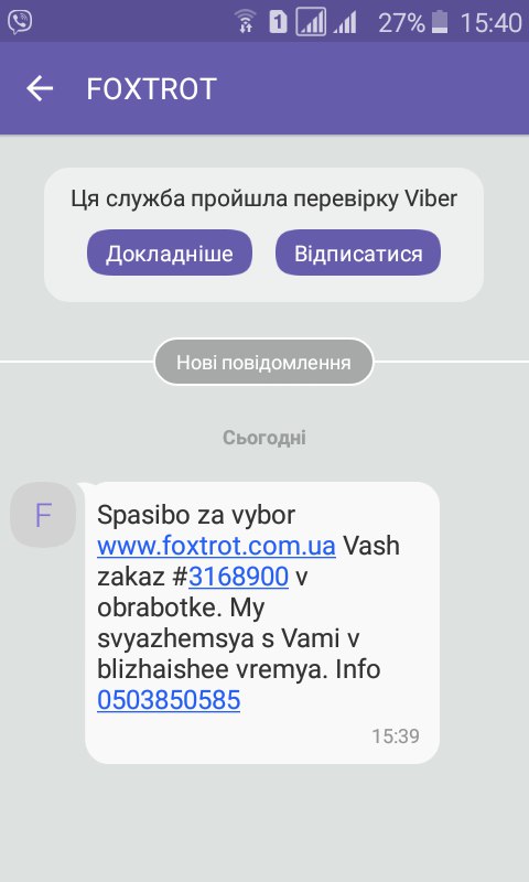 Решаю заказать в один клик и нажимаю «Купить в один клик». Я пропустила звонок от оператора и получила в Viber сообщение: