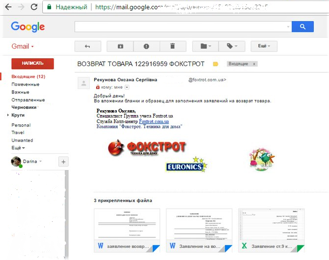 Оператор отвечает, что мой вопрос зафиксирован — его решат в течение 8 часов или завтра до 09:40. Но через час перезванивает другой оператор, принимает заявку и высылает документы на возврат на почту. Предлагает совершить возврат в ближайшем магазине «Фокстрот», но я не имею возможности свободно перемещаться и прошу прислать курьера.