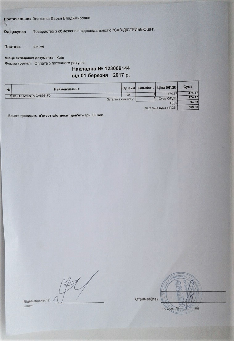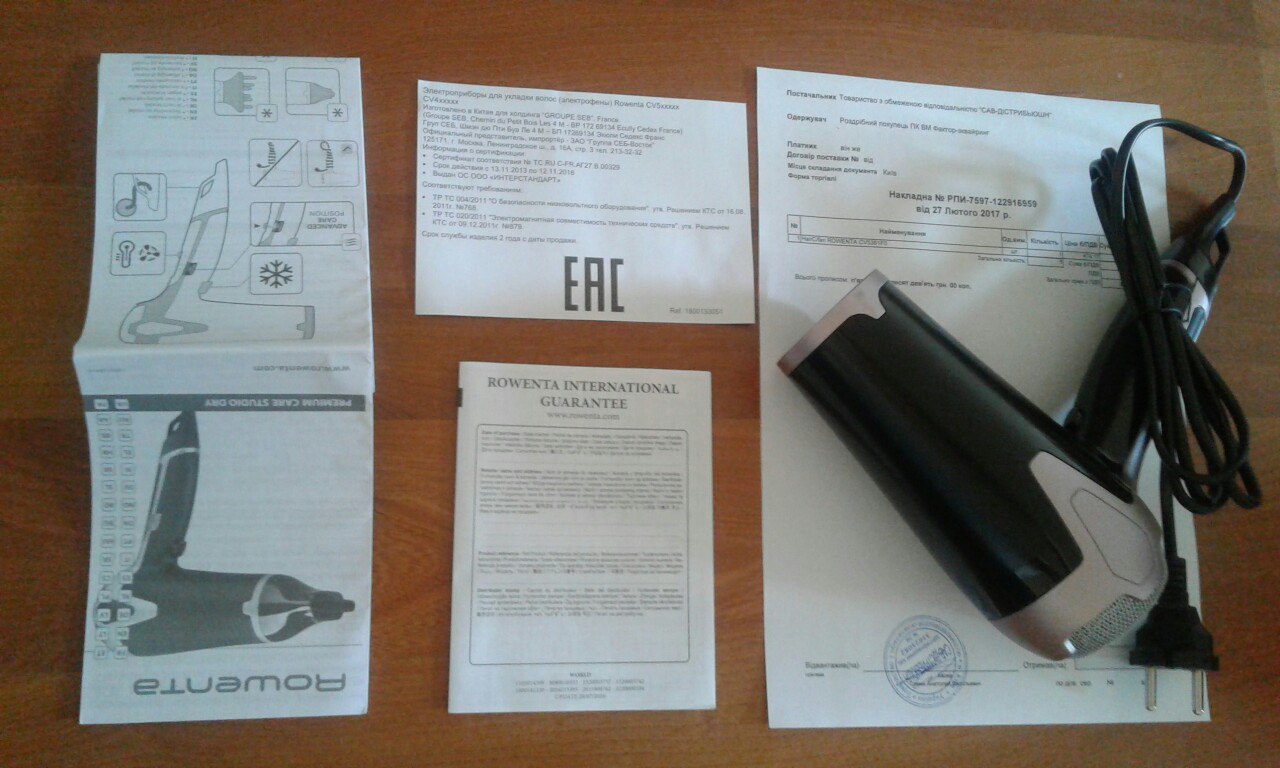 Вместе с коробкой от фена я получила приходную накладную. В коробке находилась инструкция и незаполненная продавцом гарантия на товар.