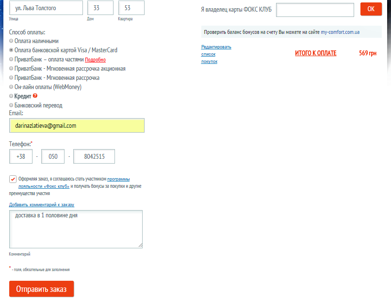 Стоит галочка напротив пункта «Оформляя заказ, я соглашаюсь стать участником программы лояльности «Фокс клуб» и получать бонусы за покупки и другие преимущества участия». Соглашаюсь.