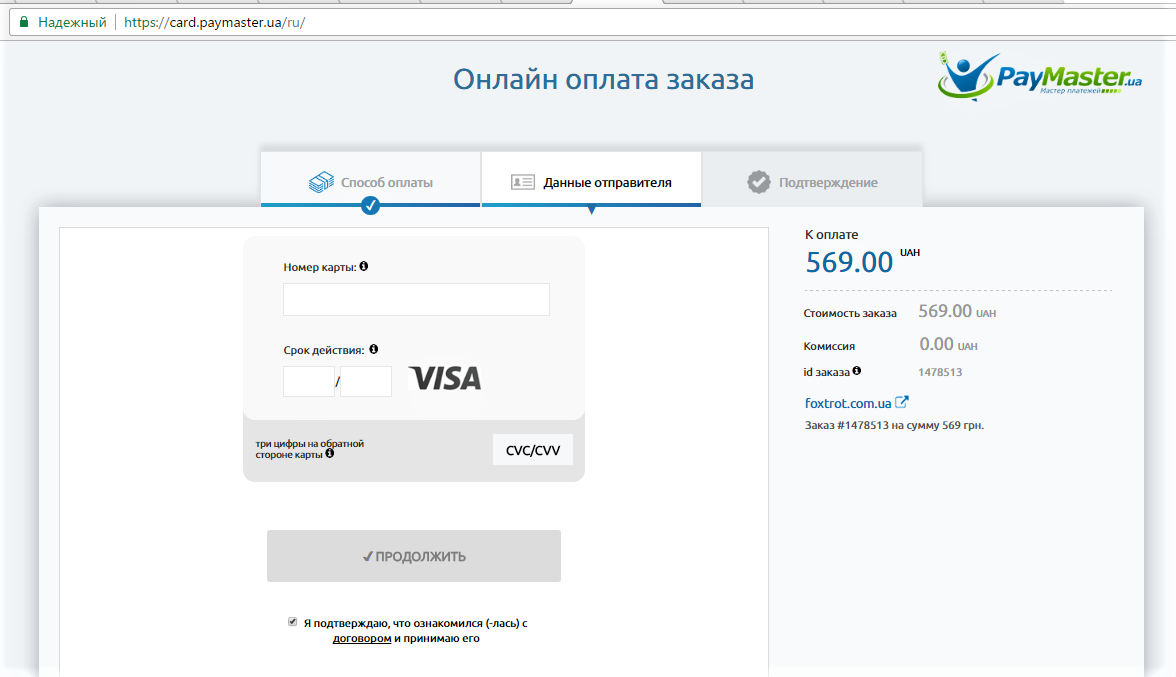 Нажимаю «Отправить заказ», происходит переадресация на сервис оплаты paymaster.ua.