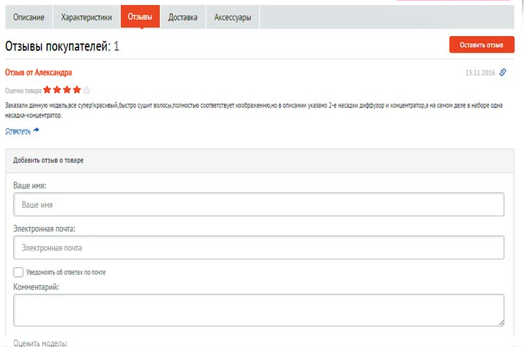 Вижу отзыв о товаре от ноября 2016 года: «Заказали данную модель, все супер! Красивый, быстро сушит волосы, полностью соответствует изображению, но в описании указано две насадки — диффузор и концентратор, а на самом деле в наборе одна насадка-концентратор».