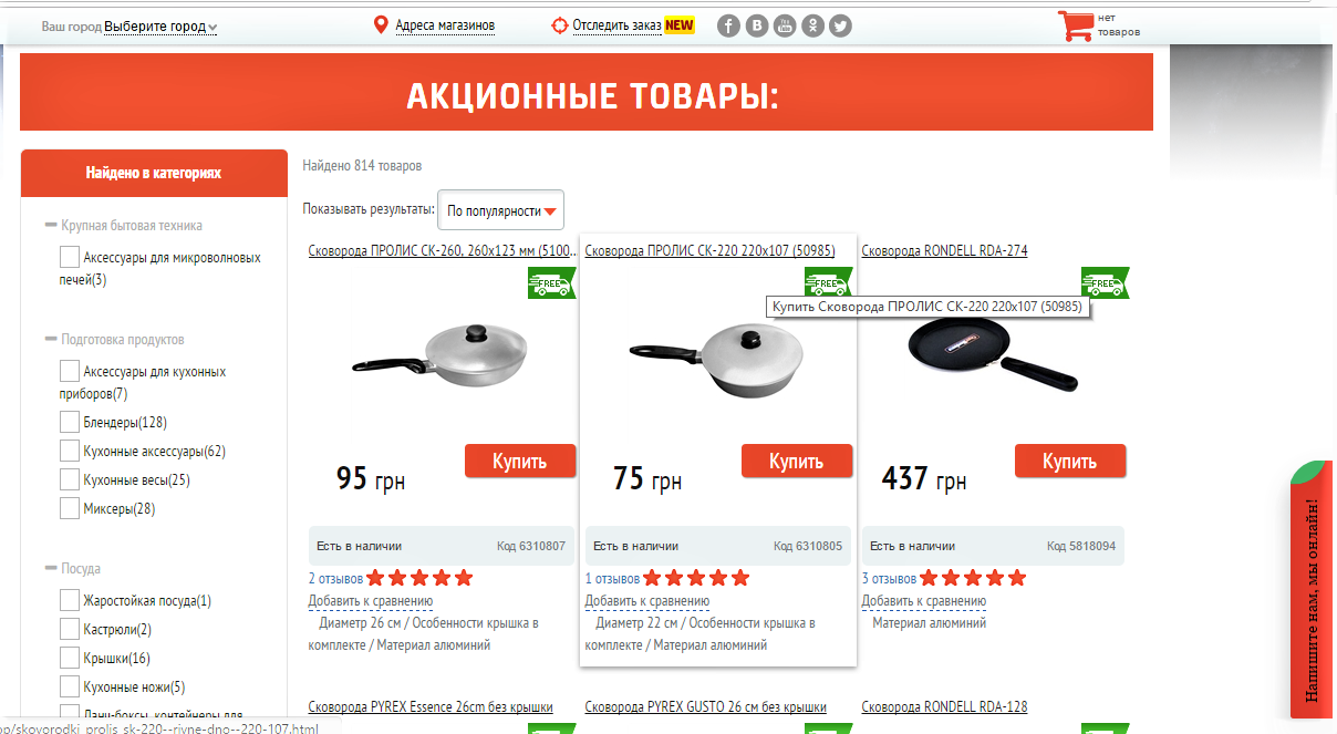Кликнув на баннер, перехожу на страницу скидочных товаров, где представлены сковородки, миксеры, блинницы, бутербродницы, блендеры по сниженным ценам.