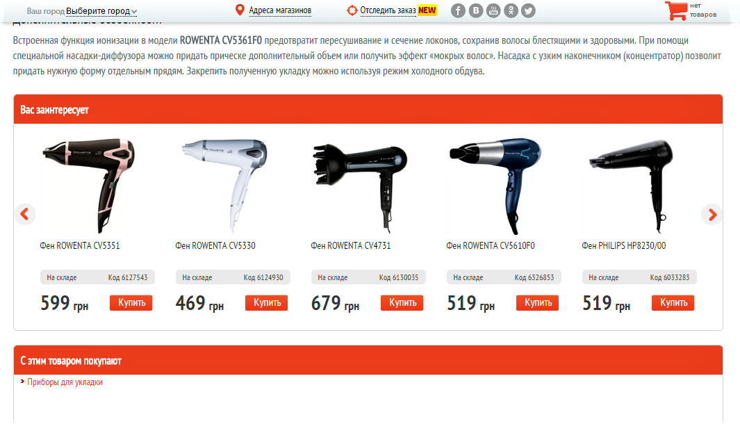 Решаю приобрести фен. Выставляю фильтры, которых у магазина много: стоимость, тип, торговая марка, мощность, материал/покрытие нагревательного элемента, количество режимов (скорость/температура), насадки, функции. В принципе, стандартный набор для фена.