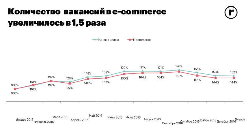 В 2016-м количество вакансий в сфере e-commerce выросло в 1,5 раза