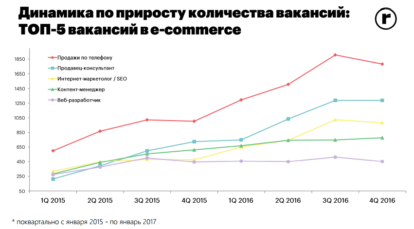 С декабря 2015-го по январь 2017-го на портале чаще всего размещались такие вакансии, как продавец по телефону, продавец-консультант, интернет-маркетолог/SEO, контент-менеджер, веб-разработчик.