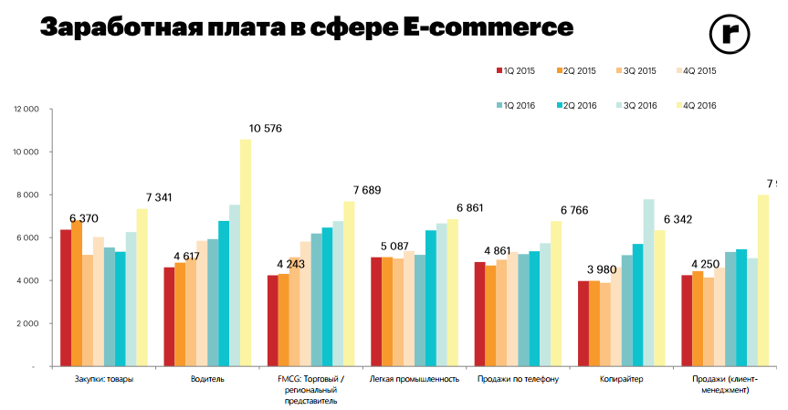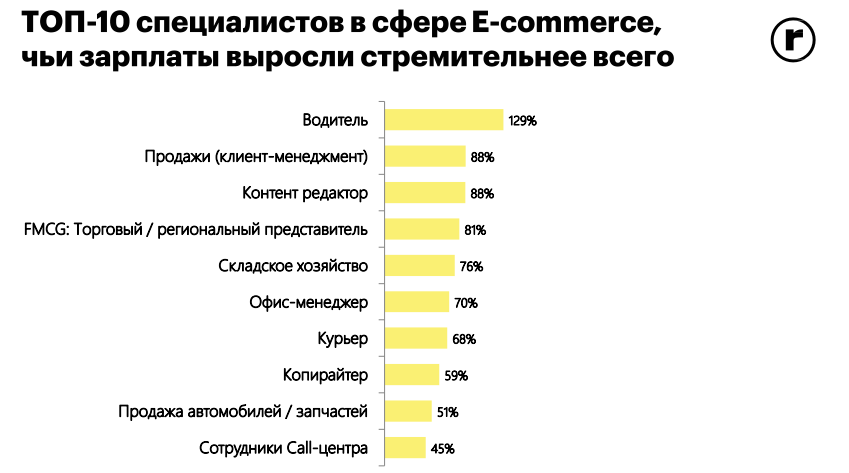 Больше всего зарплата в сегменте e-commerce выросла у водителей - 129%, продажников - на 88%, и контент-редакторов - 88%.