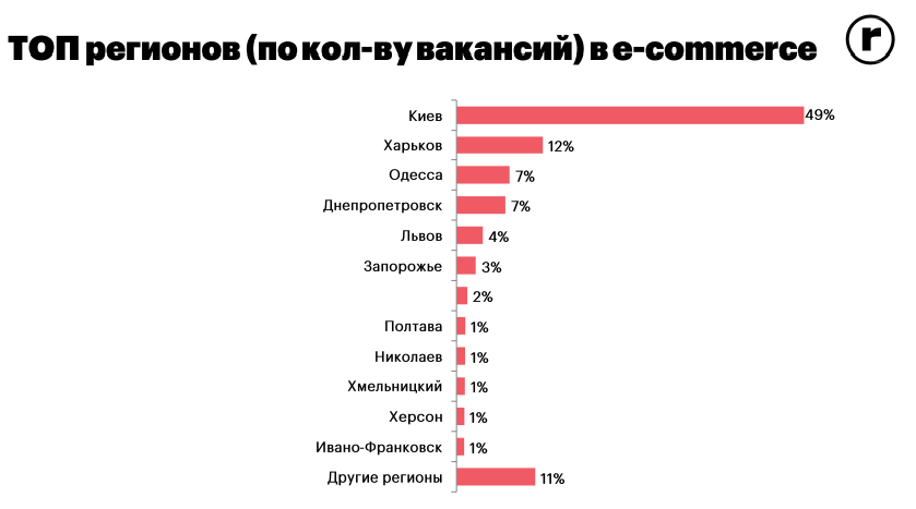 Главным работодателем в e-commerce является Киев — почти половина вакансий находится именно здесь. Второе занимает Харьковская область — 12%, третье-четвертое места с 7% вакансий делят Днепропетровская и Одесская области.