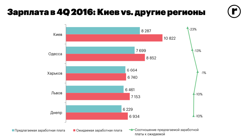 По результатам 4 квартала 2016-го, самое высокое значение среднего уровня зарплаты работодатели предлагают в Киеве (8 287 грн), на втором месте Одесса (7 699 грн), на третьем — Харьков (6 664 грн).