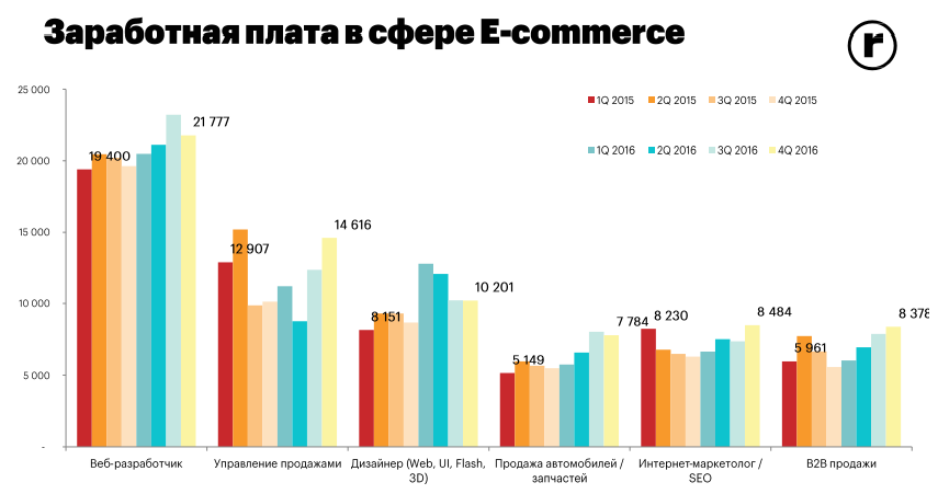 Самые высокие зарплаты в e-commerce в 4 квартале 2016-го у веб-разработчиков — 21 777 грн. Затем идет управление продажами — 14 616 грн, затем дизайнеры — 10 201 грн.