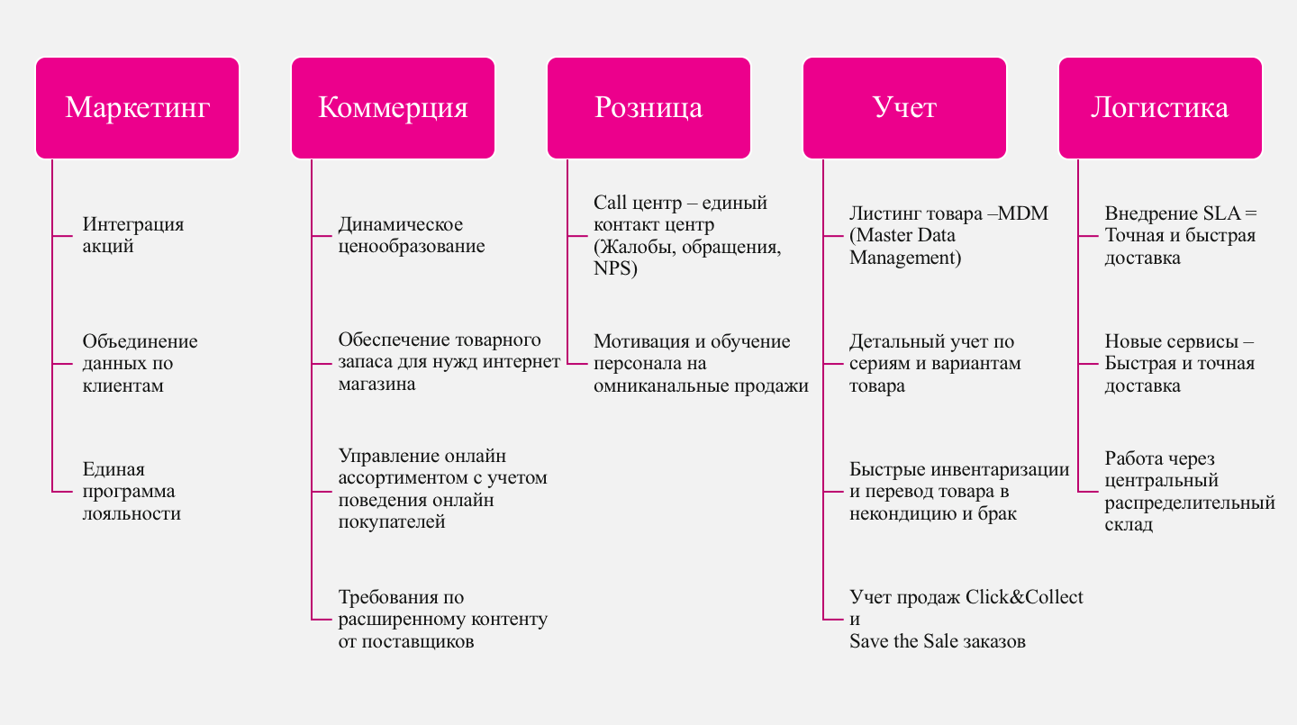 По словам Дмитрия Бондаренко, у всех ритейлеров одни и те же болезни. Структура компаний похожа и имеет такие универсальные категории: маркетинг, коммерция, розница, учет и логистика. Именно их нужно систематизировать для внедрения омниканального подхода.