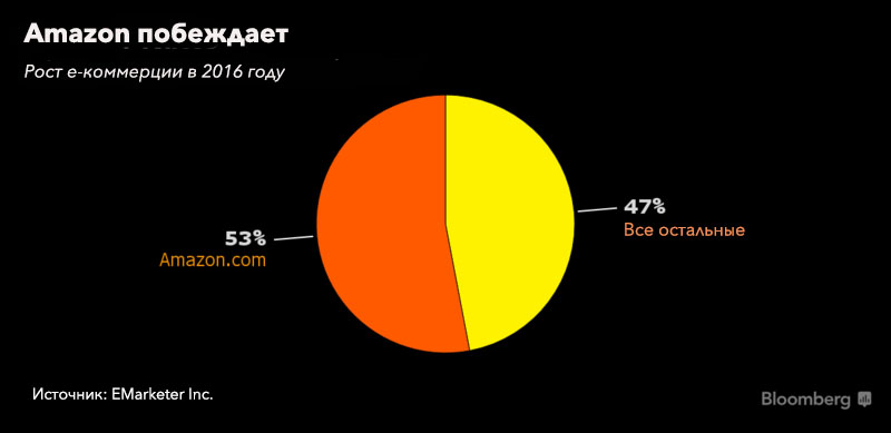 Сиэтлская компания обеспечила 53% роста продаж электронной коммерции в прошлом году, а остальная часть отрасли разделила оставшиеся 47%, согласно EMarketer Inc.