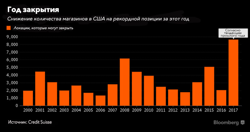 Согласно данным аналитика Credit Suisse Group AG Кристиана Бусса, закрытие магазинов за последний год превышает показатели во время сильной рецессии 2008 года в США. В докладе сказано, что в этом году было объявлено о 2 880 закрытиях, по сравнению с 1 153 закрытиями за этот период 2016 года.