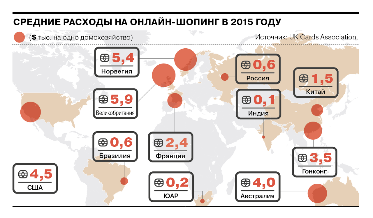 Ассоциация банковских карт Великобритании (UK Cards Association) выпустила доклад о расходах на онлайн-шопинг в разных странах мира в 2014–2016 годах. Выяснилось, что самые заядлые сетевые шопоголики живут как раз в туманном Альбионе — в среднем одно британское домохозяйство совершает покупки в сети с помощью пластиковых карт на $5 900 в год. За британцами идут норвежцы ($5 400 в год), затем жители США и Австралии ($4 500 и $4 000). Среди стран с самыми низкими расходами на онлайн-шопинг оказались ЮАР ($200 в год на домохозяйство) и Индия ($100). Об этом пишет Коммерсант