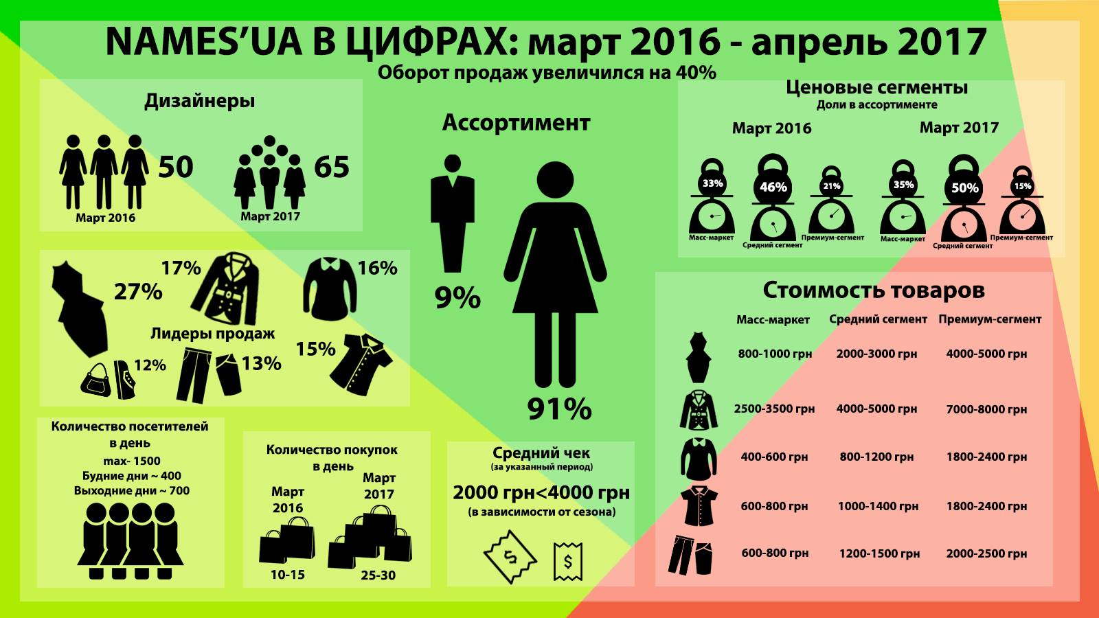 Универмаг украинских дизайнеров и производителей NAMES'UA работает в киевском ТРЦ «Проспект» уже 1,5 года. За последний год оборот универмага увеличился на 40%. Приводим основные цифры развития проекта за последний год