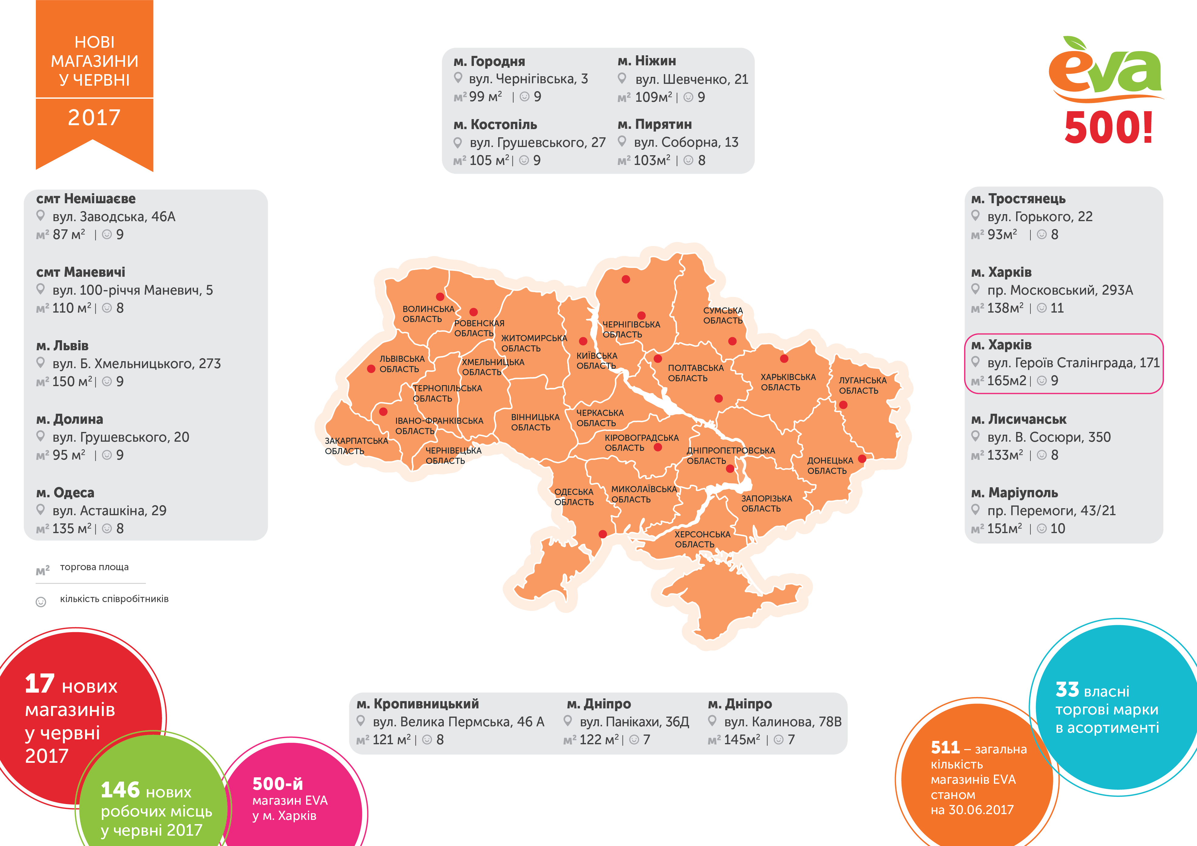 В июне 2017-го «Линия магазинов EVA» открыла 17 торговых точек и предоставила 146 новых рабочих мест. Только 30 июня открылось 5 магазинов. Общее количество магазинов EVA в Украине составляет 511