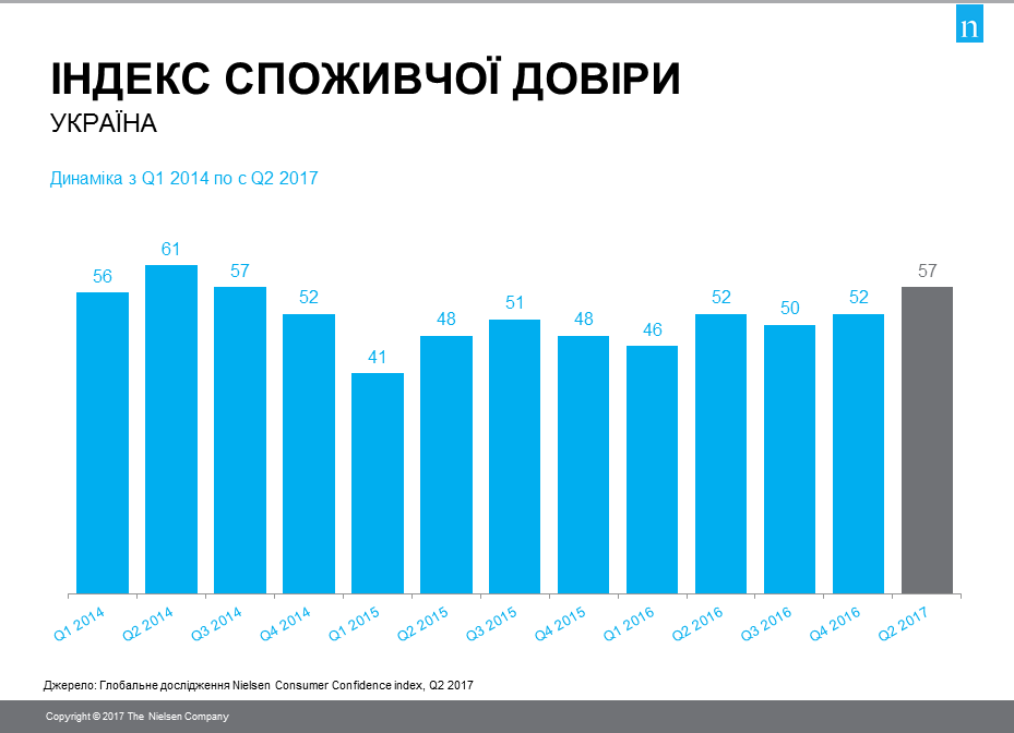 Согласно результатам исследования The Nielsen Global Consumer Confidence and Spending Intentions Survey, глобальный индекс потребительского доверия Nielsen во II квартале 2017 года показывает признаки восстановления, поднявшись на 3 пункта — до 104 — по сравнению с IV кварталом 2016-го. В Украине индекс потребительского доверия растет второй квартал подряд: +5 пунктов (57) по сравнению с IV кварталом 2016 года (52).