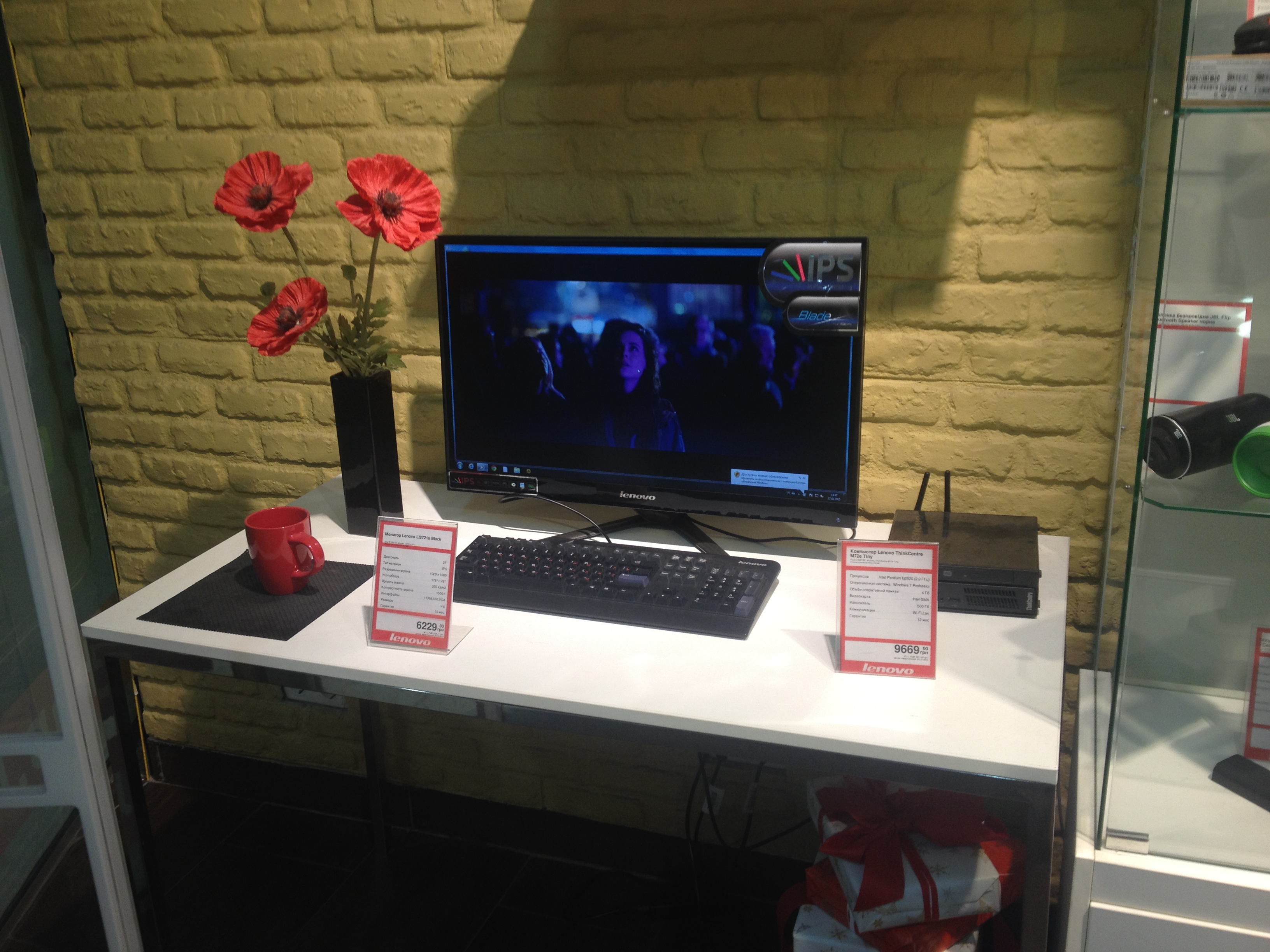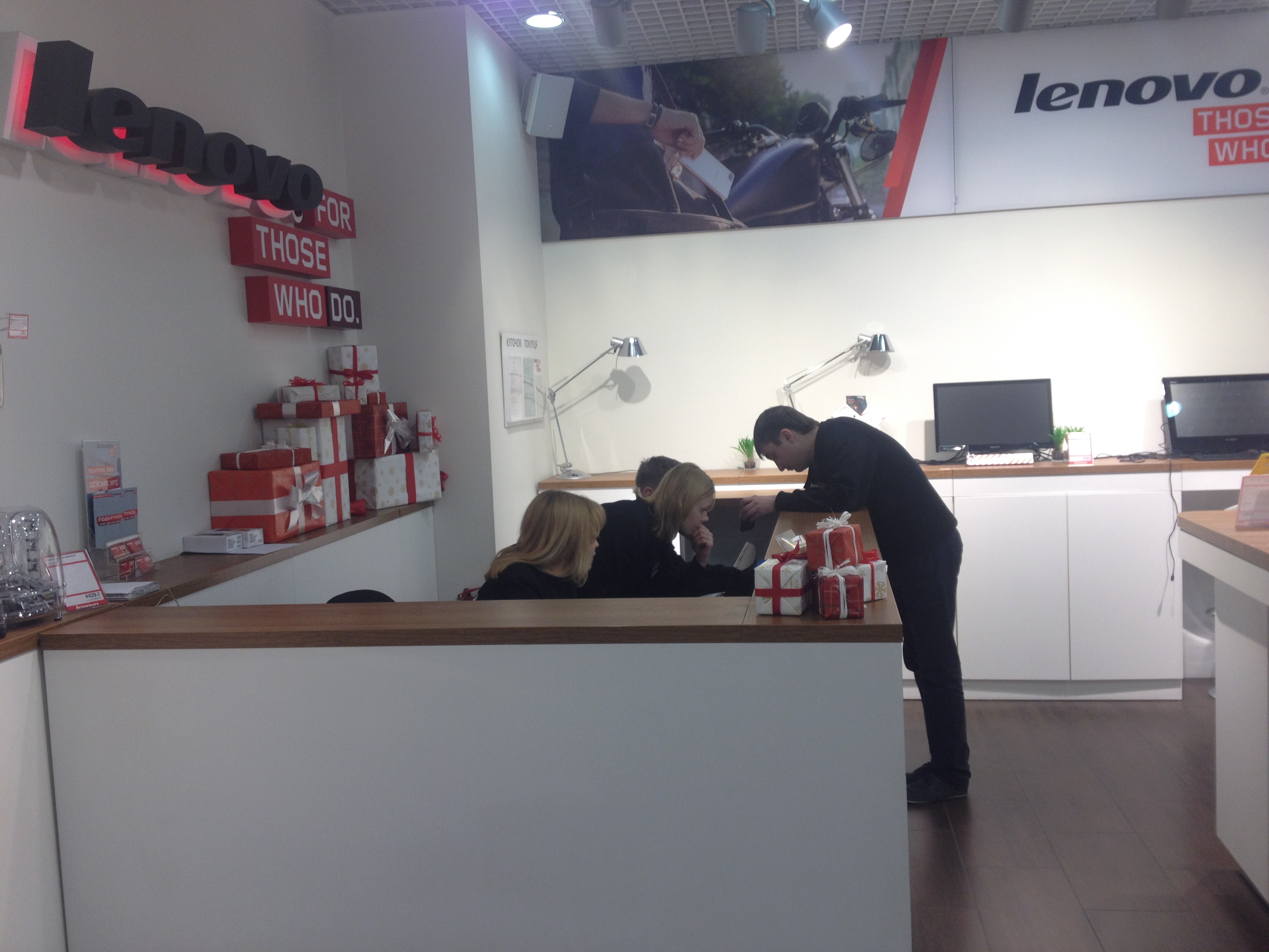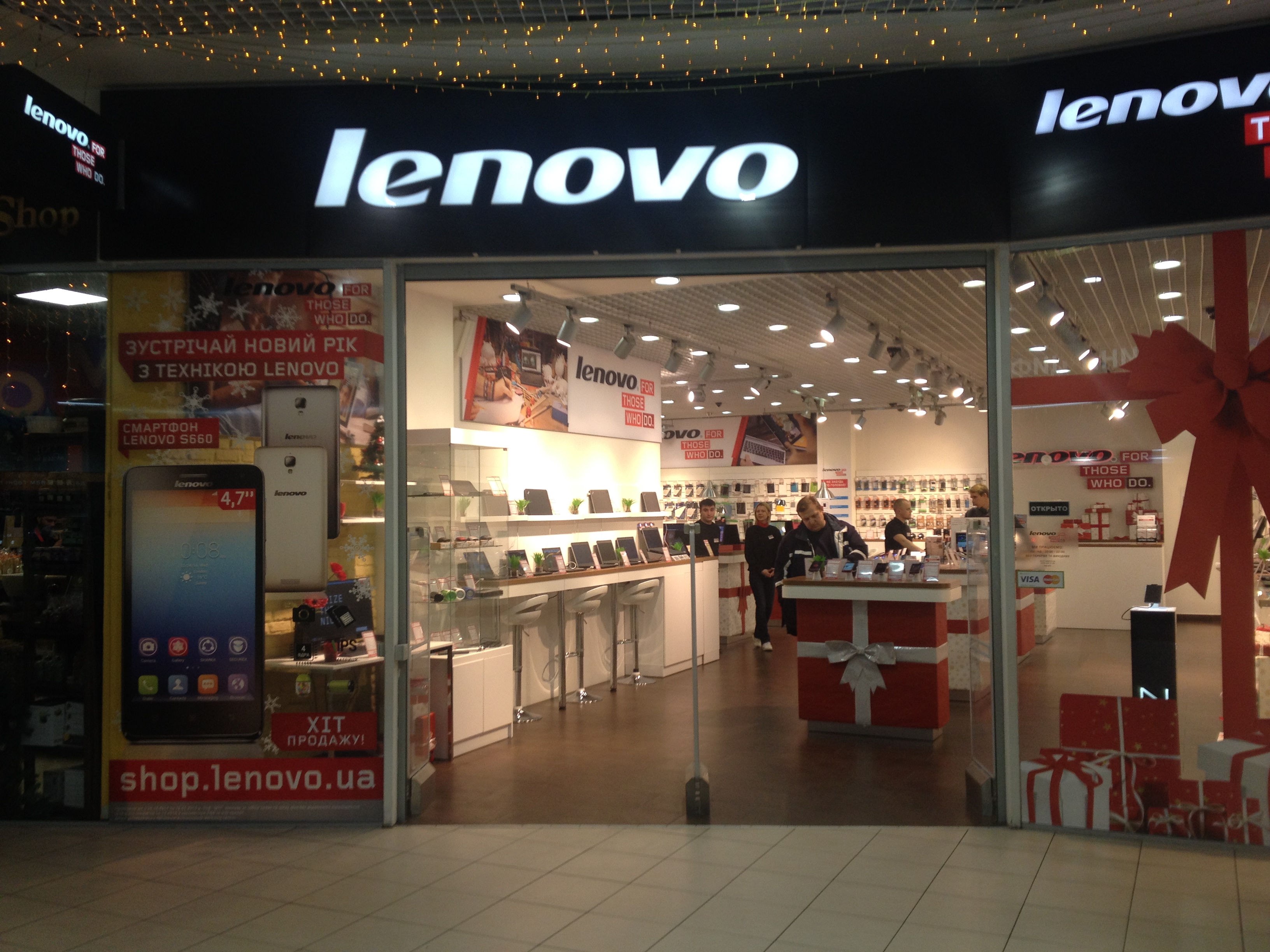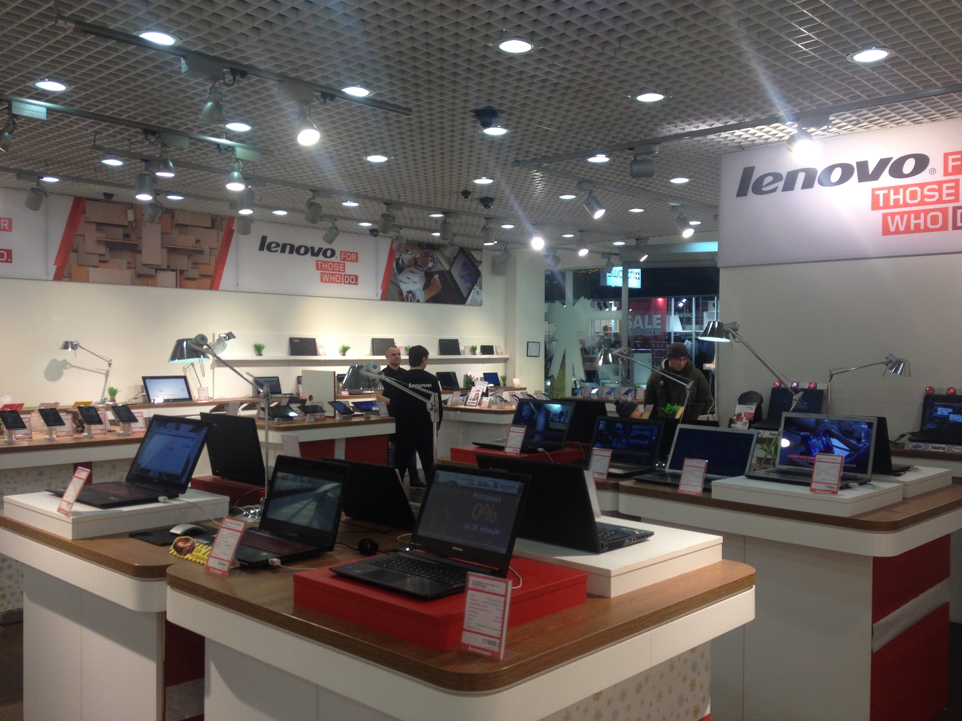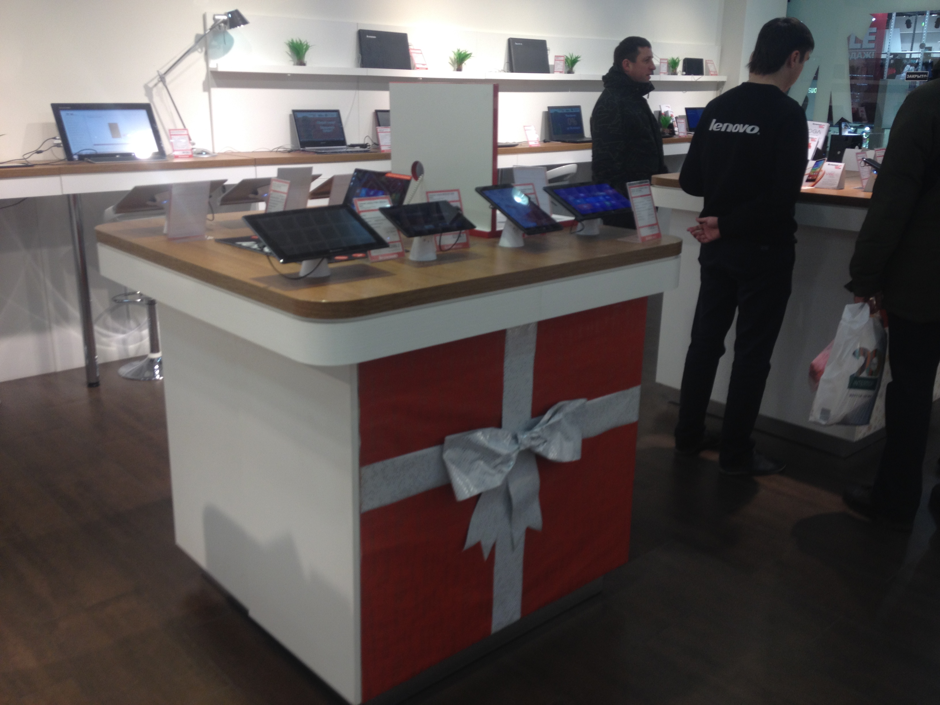 Первый монобрендовый магазин Lenovo открылся весной 2013 года в ТРЦ Dream Town, его мы и будем аудировать. Первое, что бросается в глаза, — отсутствие дверей в магазин и широкий вход. Чем меньше преград на пути потребителя к покупке, тем лучше.
