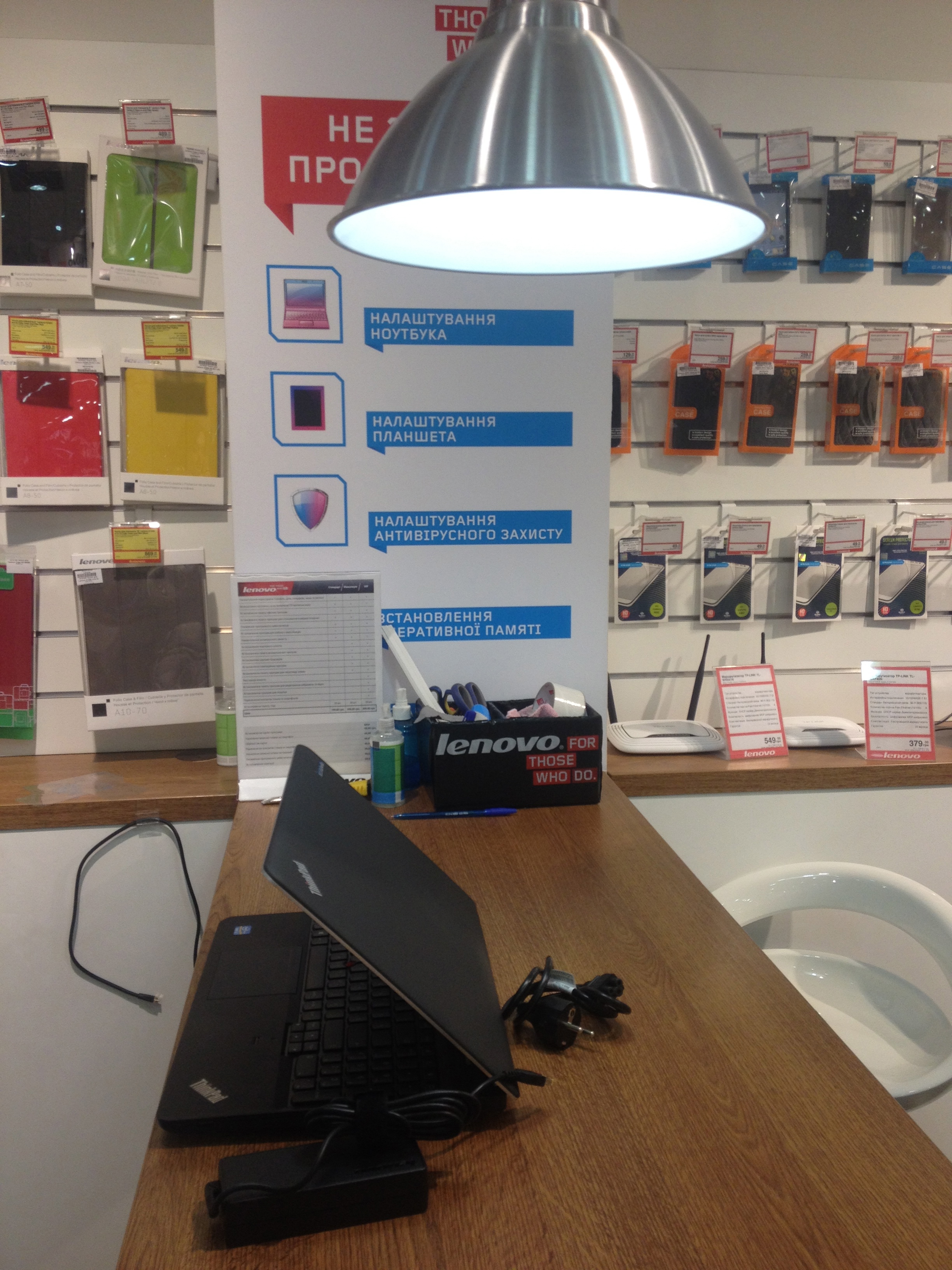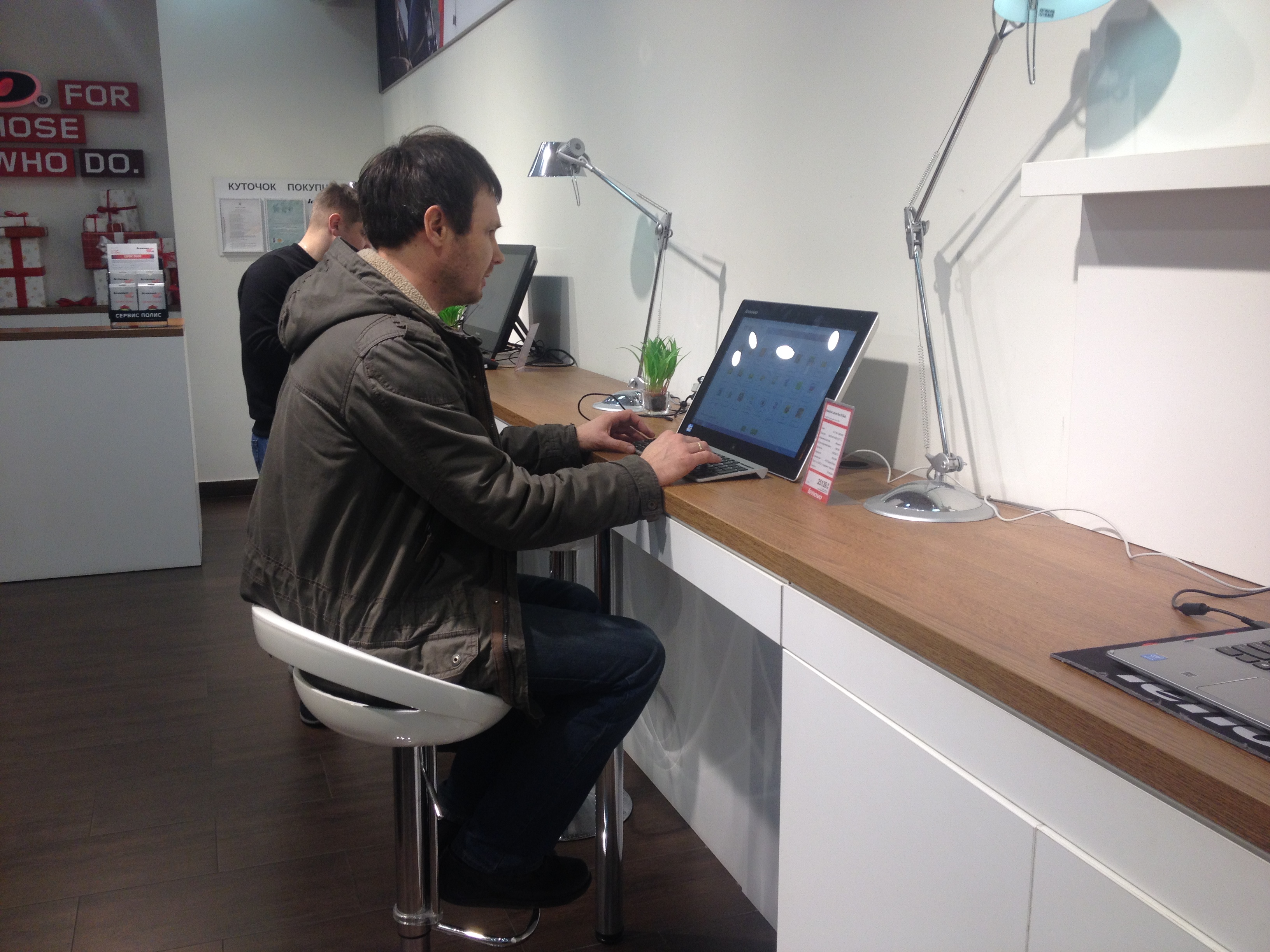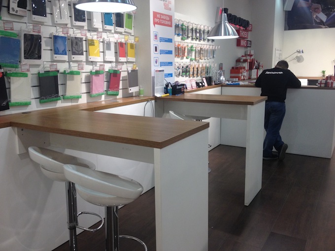 Важная деталь — отдельная зона для работы с настройками и установками. Современная электроника, будь то ноутбук или смартфон, нуждается в дополнительных установках: программного обеспечения, приложений. Процессы настроек и установок требуют времени. Чтобы потребитель не чувствовал себя дискомфортно, для него оборудовали специальную зону. Лампа сверху дает ощущение, опять же, домашнего уюта, как будто работаешь в собственном кабинете.
