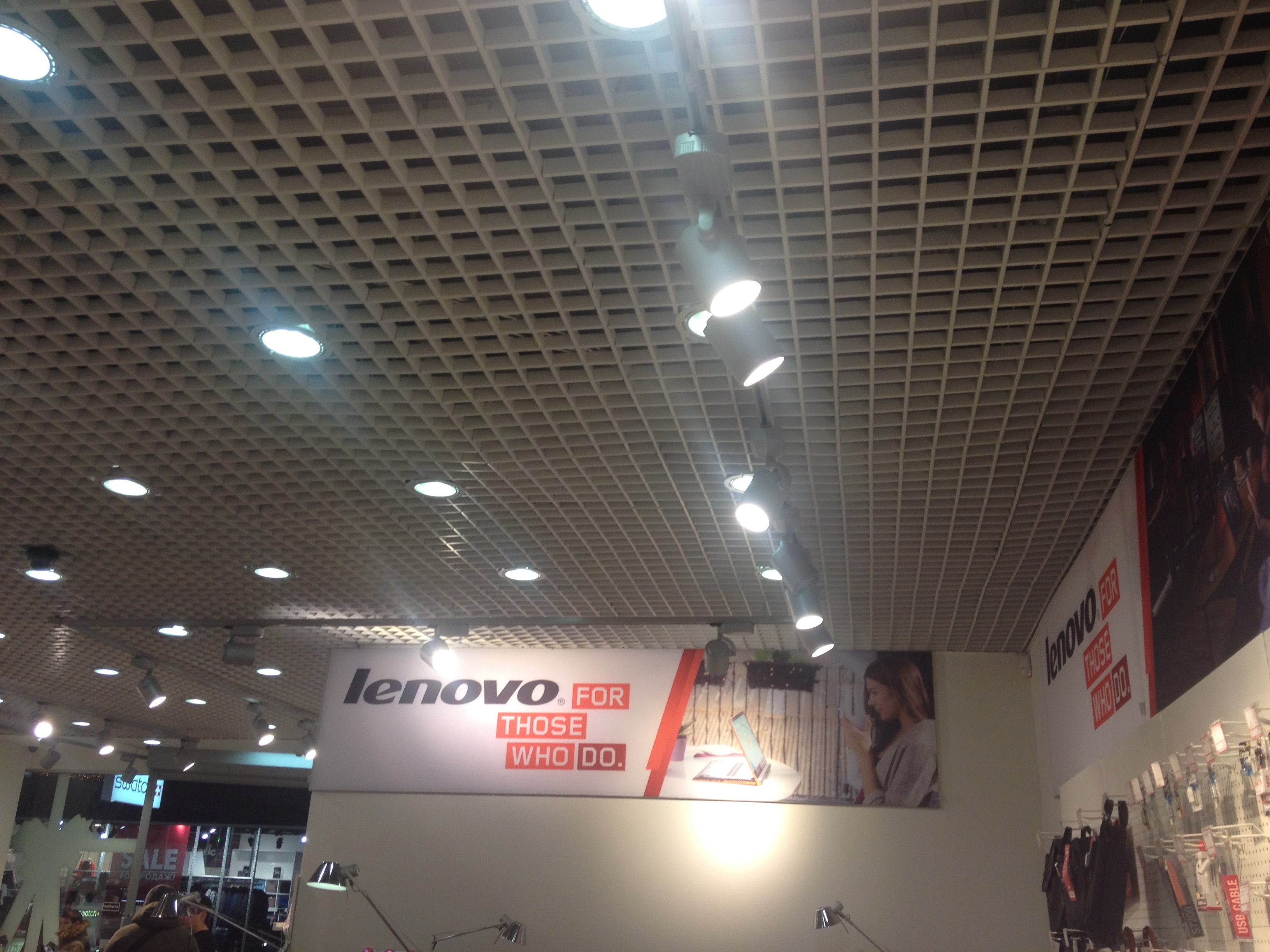 Важно отметить, что в Lenovo правильное двухуровневое освещение. Для любого ритейлера освещение — одна из весомых статей расходов. Профессиональные светильники стоят немало, к тому же они расходуют электричество. В данном магазине используется общий «теплый» свет и направленные светильники, которые подсвечивают аксессуары, благодаря чему их хорошо видно. Специально подсвечивать ноутбуки и смартфоны нет смысла, потому что у них светятся экраны. Однако на столах с ноутбуками есть красивые офисные настольные лампы, которые добавляют акцент и атмосферу.