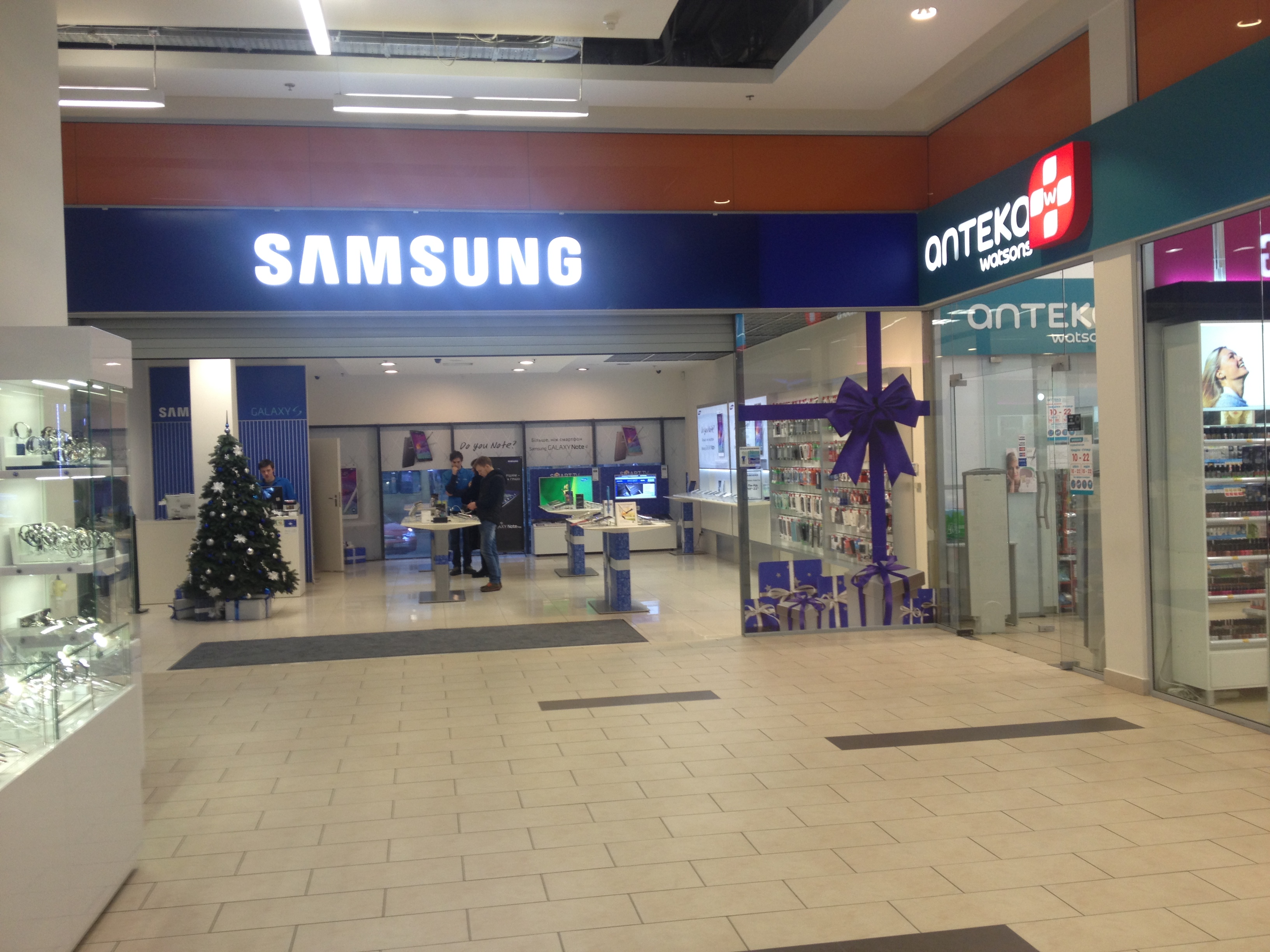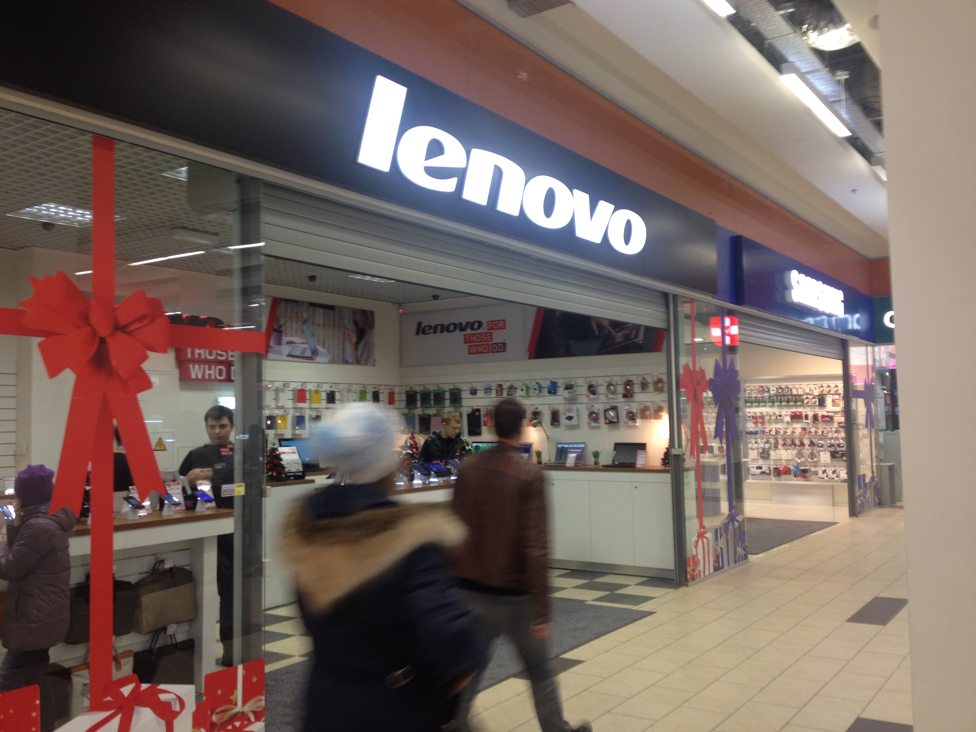 Компания MTI развивает не только монобрендовые магазины Lenovo, но и Samsung. В ТРЦ «Аладдин» Lenovo и Samsung находятся рядом, дверь в дверь, что создает привлекательное место для посетителей. Оба бренда используют один и тот же трафик, усиливая его. Это выгодно и Lenovo, и Samsung. И особенно выгодно MTI. Отсутствие фронтального остекления и идентичное новогоднее оформление магазинов создают ощущение одного общего пространства с хорошим выбором IT-продукции.