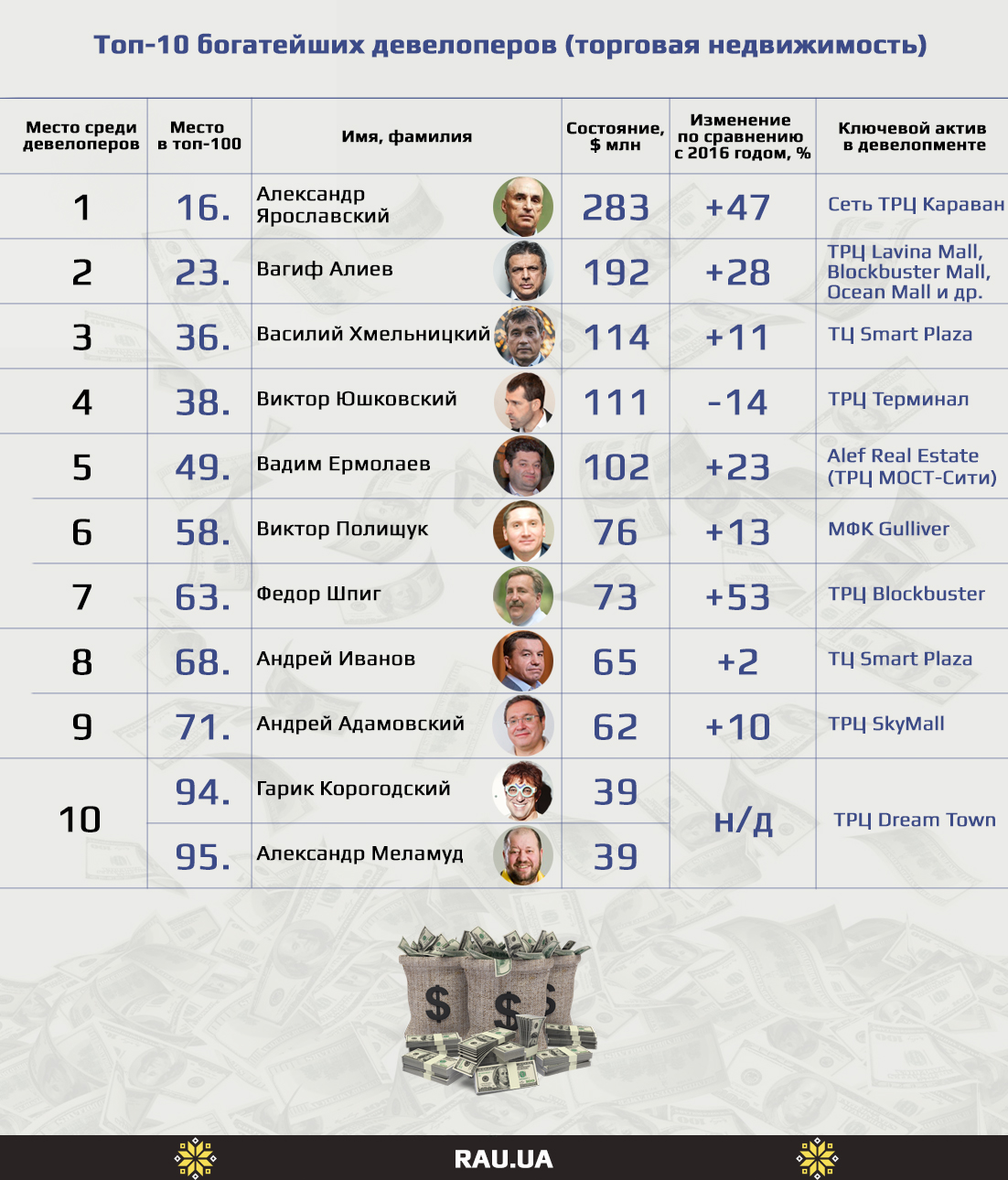 Среди самых богатых девелоперов также в основном «знакомые все лица». Среди многочисленных активов бенефициара группы DCH Александра Ярославского числятся и три торгово-развлекательных центра «Караван» — в Киеве, Днепре и Харькове. Сложно сказать, какой вклад они вносят в консолидированную прибыль группы, но бизнесмен, обычно легко расстающийся с неприбыльными активами, продавать ТРЦ не спешит. По итогам года Dragon Capital оценил состояние Ярославского в $283 млн.