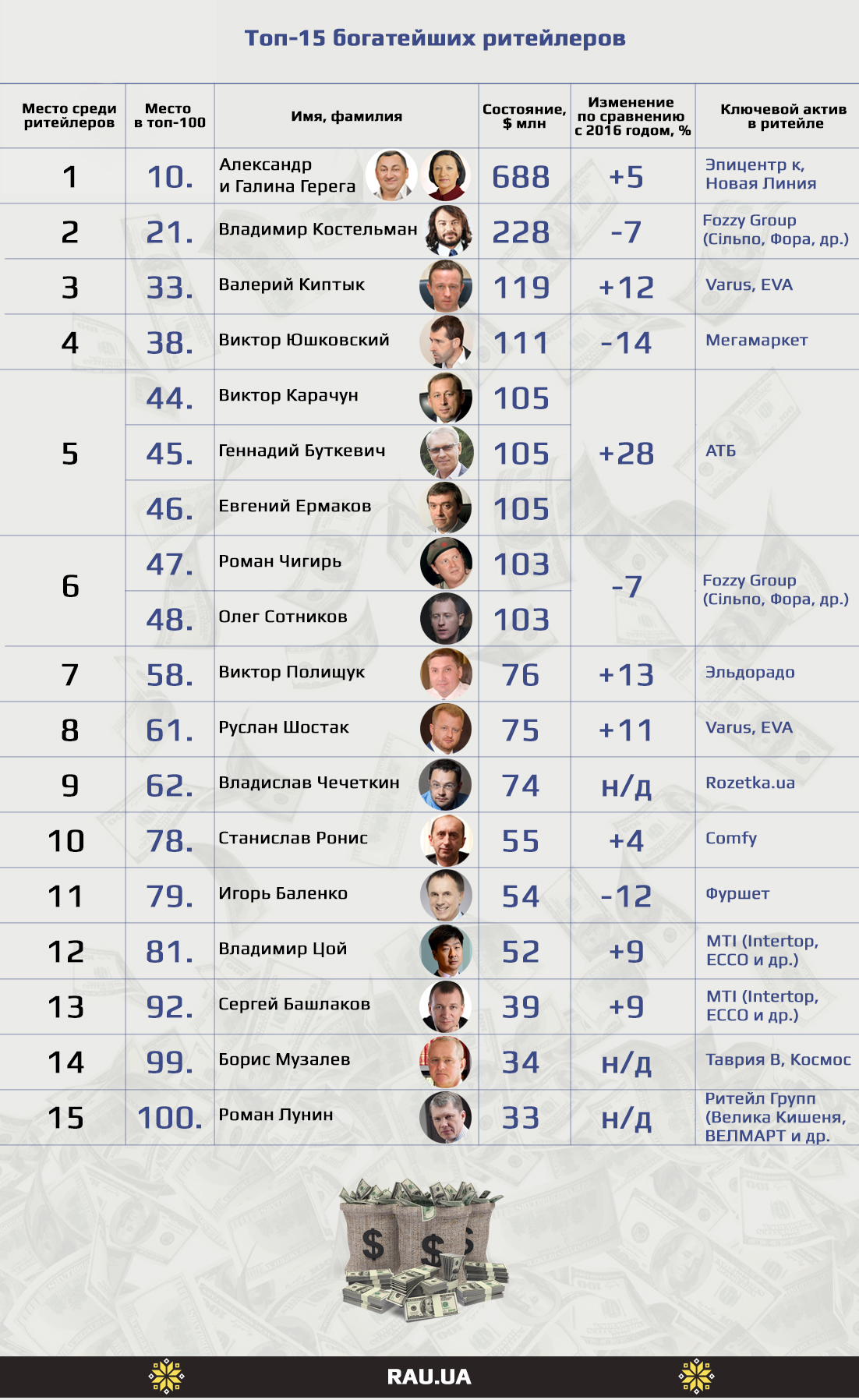 Журнал «Новое время» совместно с инвестиционной компанией Dragon Capital презентовал очередное ежегодное исследование «Топ-100 самых богатых украинцев». Это уже 11-й по счету рейтинг (до 2013 года он публиковался в журнале «Корреспондент»). RAU изучила рейтинг и на его основе составила список самых богатых ритейлеров и девелоперов