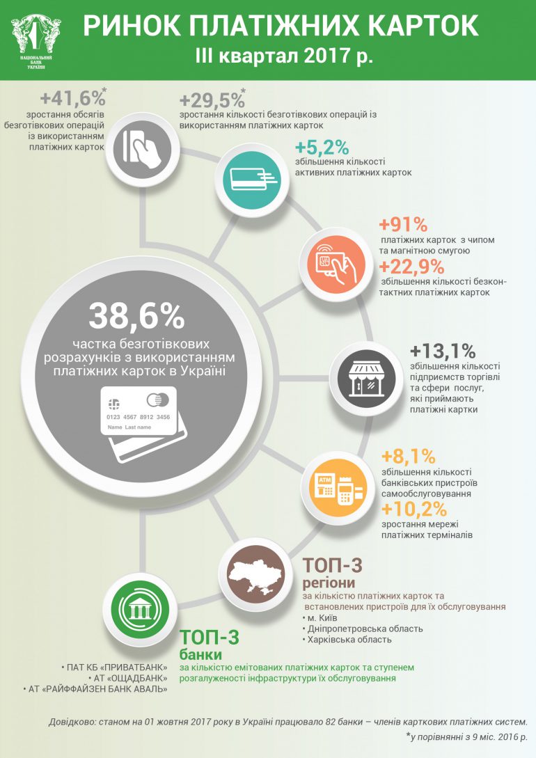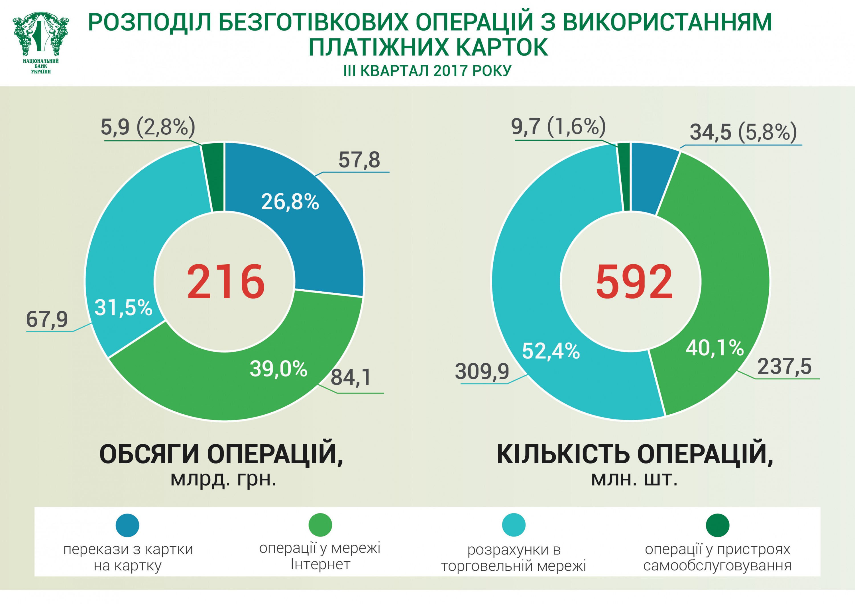 Общее количество операций с использованием платежных карточек, эмитированных украинскими банками, за три квартала 2017 года составило 2,22 млрд шт., а их объем — 1458 млрд грн, то есть, по сравнению с аналогичным периодом 2016 года, эти показатели выросли соответственно на 22,2 и 29,0%. При этом наблюдается устойчивый рост именно безналичных расчетов — по количеству операций на 29,5% и по объему на 41,6%, по сравнению с аналогичным периодом 2016 года.