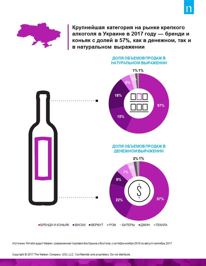 Cогласно данным ритейл-аудита Nielsen, в период с октября-ноября 2016 по август-сентябрь 2017 года, по сравнению с аналогичным периодом годом ранее, украинский рынок алкоголя (бренди, коньяк, виски, вермут, битеры, джин, текила; в категорию не входит водка, игристые и шампанские вина) показал рост продаж на 3,1% в натуральном выражении в канале современной торговли против падения на 10% за тот же период прошлого года. В денежном выражении продажи демонстрируют рост: 24,2% в 2017 против 13,8% в 2016 году. Цены в категории крепкого алкоголя продолжили расти, но темпы немного замедлились: с 26,4% в прошлом году до 20,5% в 2017-м