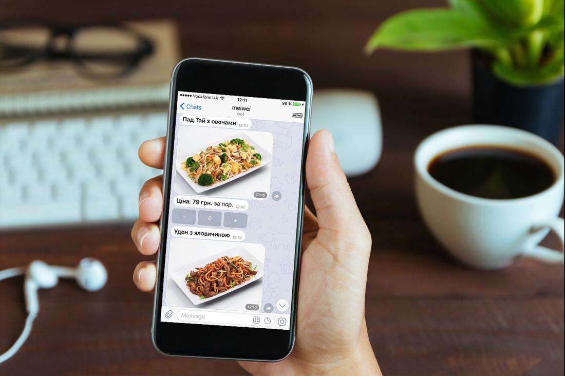 Сделать заказ через чат-бот можно на любой из трех платформ: Facebook m.me/meiwei.okko, Telegram t.me/meiweibot или Viber viber.com/meiwei, оплатив его наличными, картой онлайн или через терминал курьеру. Также функционал позволяет воспользоваться имеющейся скидкой и накапливать баллы на карту Fishka, которыми впоследствии можно будет рассчитаться за товары и услуги в сети партнеров программы лояльности.