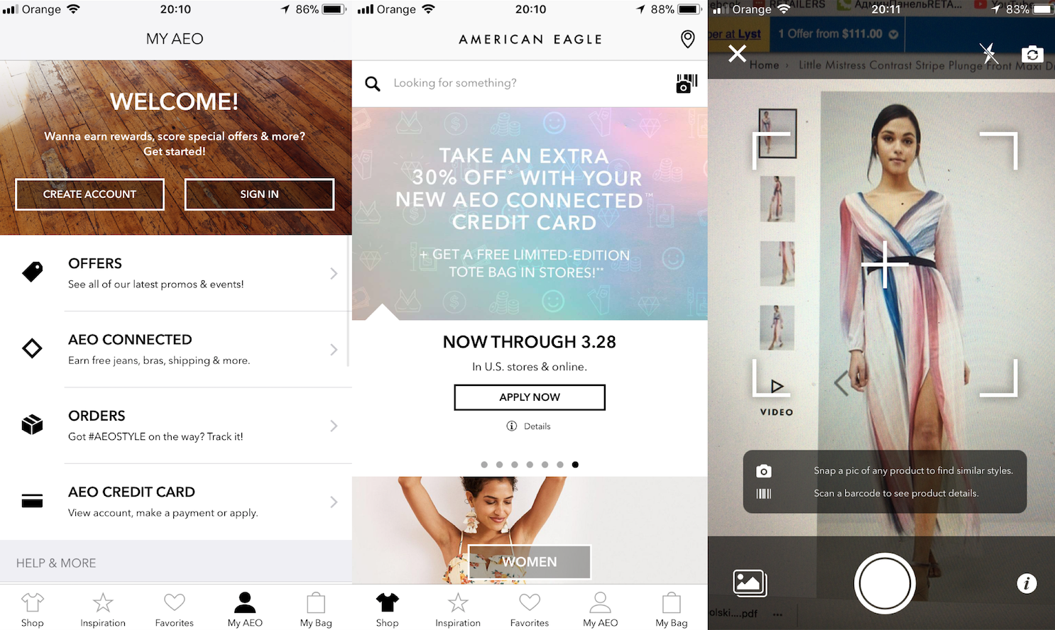В приложении American Eagle есть фотосканер, который позволяет сделать фотографию понравившейся одежды, и система подберет нечто похожее по форме, цвету и стилю. Также покупатель может сканировать штрихкод понравившегося наряда в обычном магазине и быстро купить его онлайн.