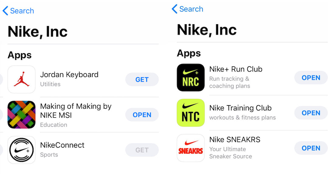 Nike поддерживает шесть бесплатных приложений в AppStore: Nike+ Run Club, Nike Training Club, Nike SNEAKRS, Jordan Keyboard, Making of Making by Nike MSI, NikeConnect. Это значительно затруднило продвижение конкурентов в App Store, ведь одно дело — обойти одно приложение конкурента, а совсем другое — шесть.