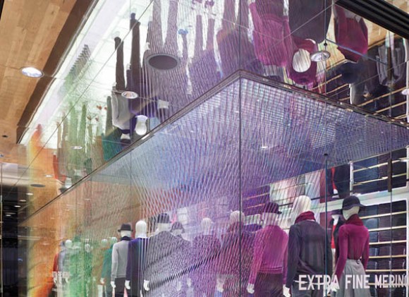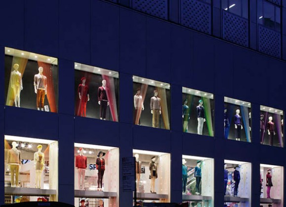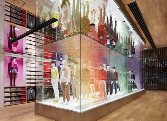 Французский архитектор с японской пропиской Эммануэль Моро известна своей любовью к ярким цветам и радужным палитрам. Ее визуальная философия очень близка бренду Uniqlo, именно поэтому они пригласили Моро разрабатывать глобальную концепцию оформления своих магазинов, в том числе и флагмана на Пятой авеню, для осеннего сезона 2014. Основной акцент сделан на витринах, которые служат светящимся порталом в разноцветный мир японского ready-to-wear. Их неукоснительная симметрия продолжается в дизайне торгового пространства, поделенного ровными шеренгами манекенов.