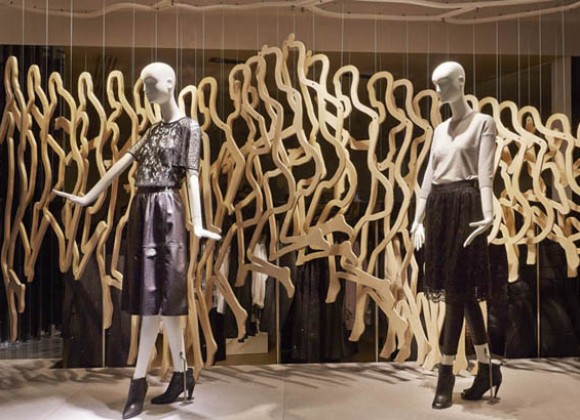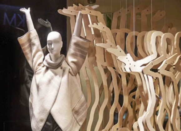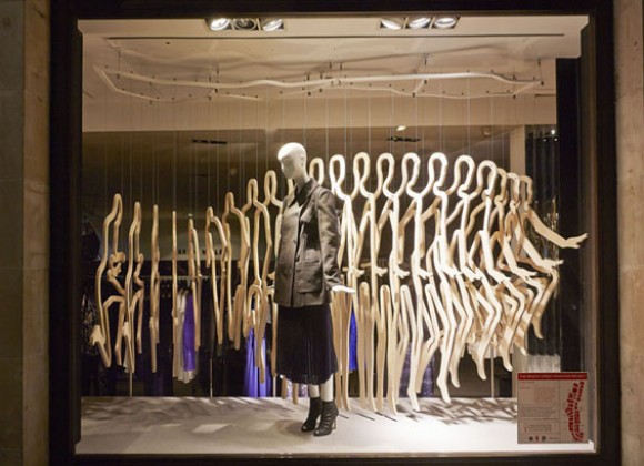 Одна из самых простых и вместе с тем запоминающихся витрин 2014 года принадлежит магазину Karen Millen на фешенебельной лондонской Риджент-стрит. Ее авторы, бюро StudioXAG, считаются большими специалистами в витринистике и ритейл-дизайне. Предложенная ими концепция — застывшая динамика. Композиция из 150 полых деревянных силуэтов создает иллюзию бесконечного движения. Эта витрина стала частью проекта Королевского института британских архитекторов, который на один сезон взялся курировать оформление витрин крупных магазинов на Риджент-стрит.