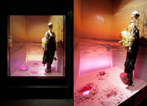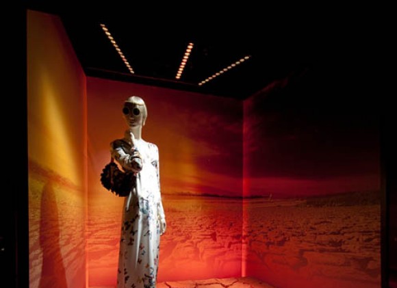 Еще одна выдающаяся летняя витрина 2014 года придумана дизайнерами знаменитого французского магазина. Они вдохновлялись абсолютно диаметральными идеями, которые все-таки удалось объединить общей стилистикой. В результате получилось нечто среднее между пустынными марсианскими пейзажами и хрониками постиндустриального апокалипсиса. Оттенки освещения колеблются от теплого оранжевого до тревожного красного и космического фиолета, а под ногами манекенов рассыпан то ли песок, то ли звездная пыль.