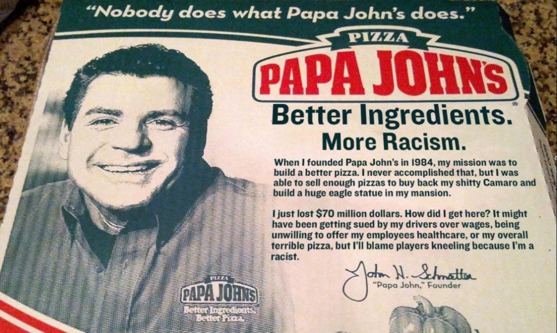 Недавно основатель Papa John's Джон Шнаттер назвал игроков NFL словом на букву "н", из-за чего его обвинили в расизме, а Шнаттеру пришлось покинуть свою компанию. Этим все не закончилось, высказывание Шнаттера стоило Papa John's репутации и денег. Аналитики предсказывают падение продаж сети общепита в третьем и четвертом квартале этого года на 12% и 10% соответственно.