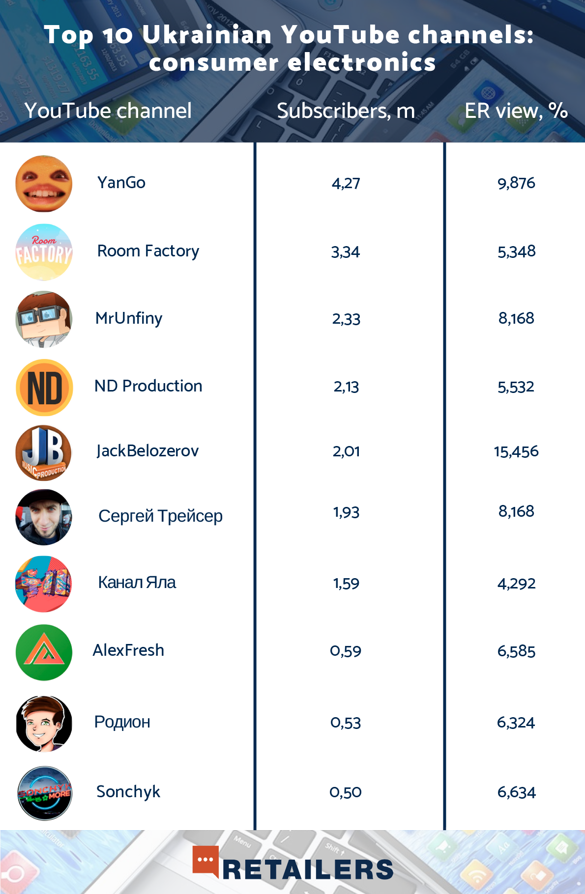 Гаджеты и электронника имеют широкую аудиторию и, следовательно, подобрать YouTube-канал для сотрудничества труднее. Для цели продвижения техно-бренда на YouTube подойдут каналы абсолютно разных тематик: lifestyle, техноблоги, обзоры компьютерных игр (летсплеи) и так далее. Retailers составил топ-10 украинских YouTube-каналов с наибольшим количеством подписчиков и тех, которые, по мнению редакции, подойдут для продвижения продукта ритейлера.