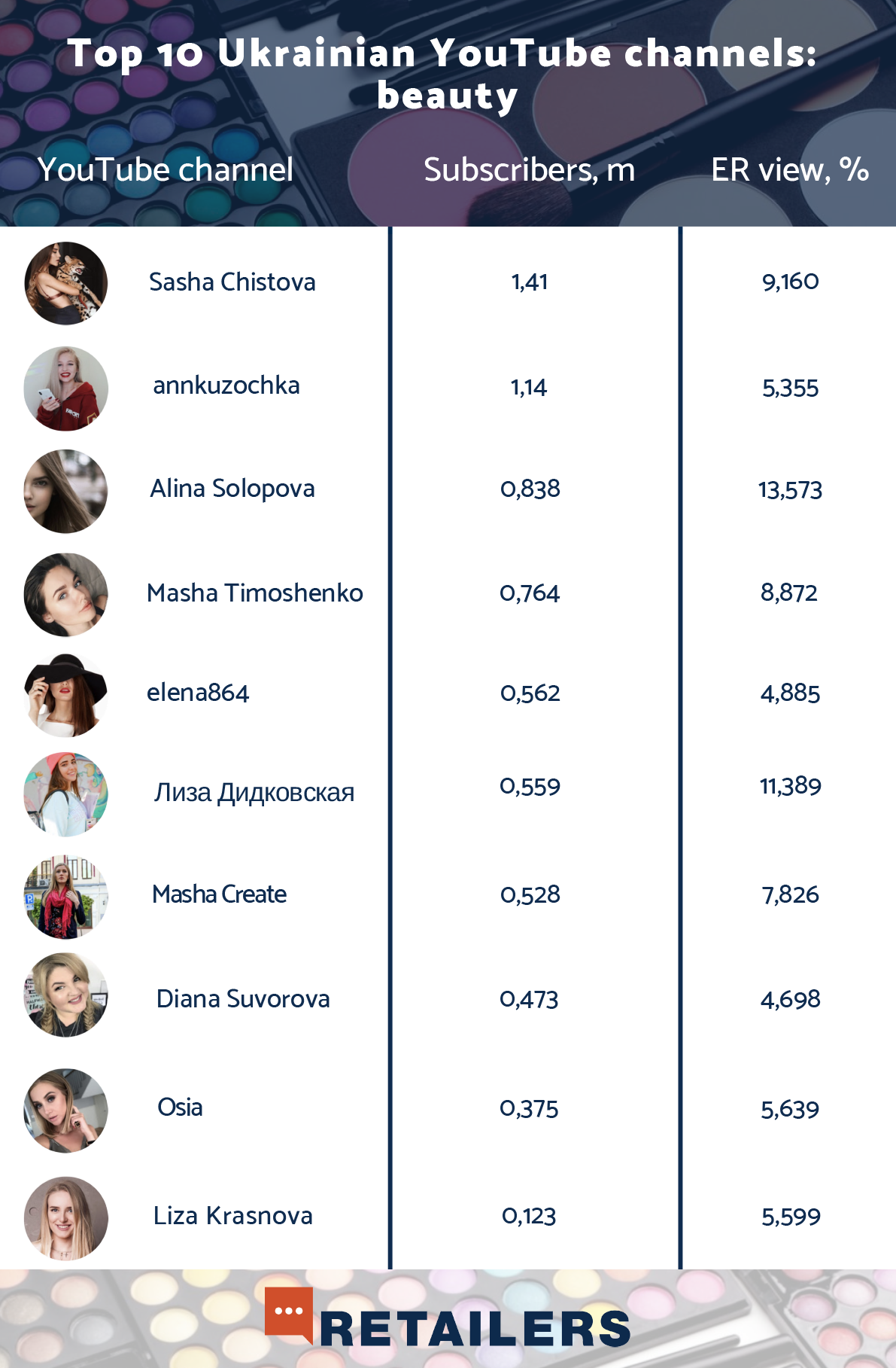 Для продвижения товаров beauty-сегмента ритейлеры используют в основном каналы beauty- и lifestyle-блогеров. Аудитория у таких YouTube-каналов преимущественно женская. В Украине данный сегмент пока представляют только девушки-блогеры, но в других странах, например, в США, beauty-блогеры мужчины не отстают. Например, Джеффри Стар (YouTube-канал jeffreestar) имеет более 10 млн подписчиков и уже выпускает собственную декоративную косметику. Retailers составил топ-10 украинских YouTube-каналов с наибольшим количеством подписчиков и тех, которые, по мнению редакции, подойдут для продвижения продукта ритейлера.
