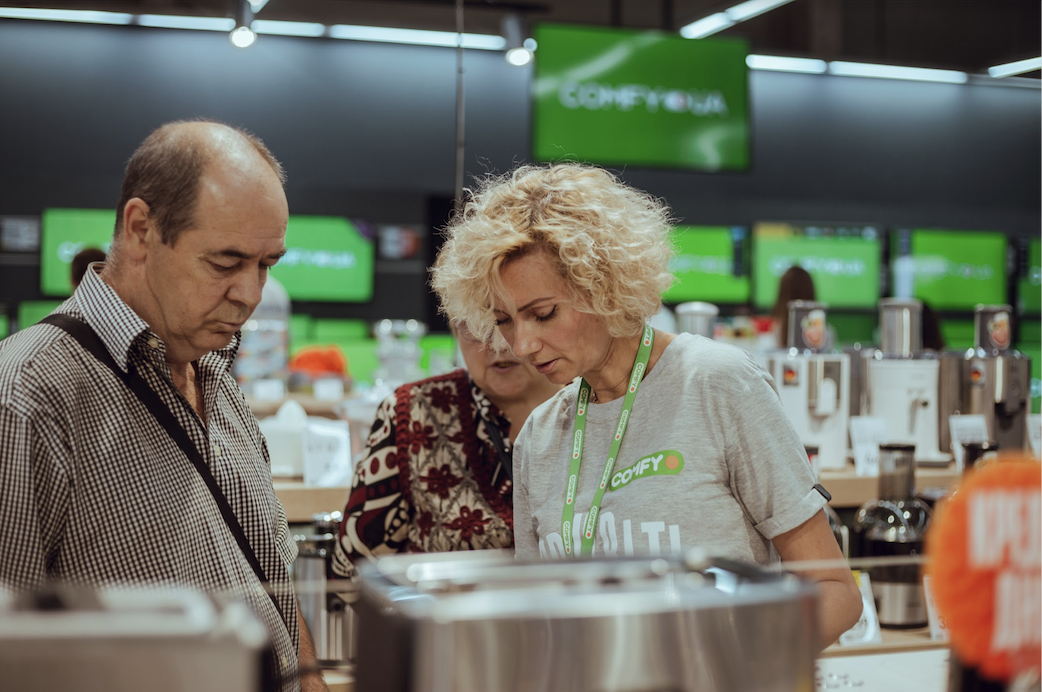 Я спросила у пожилой пары, которая выходила из магазина с покупкой, почему они выбрали магазин Comfy. На что услышала, что в других магазинах нужно искать консультантов, а здесь они сами находят покупателя.
