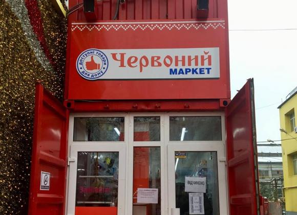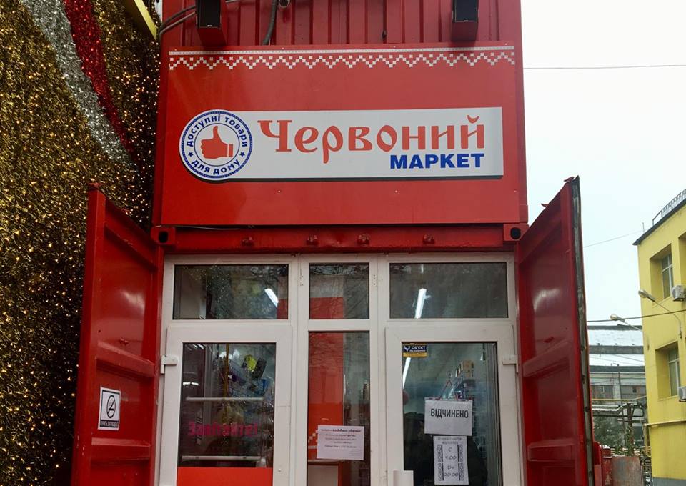 Полуавтоматизированный магазин "Червоного маркета" – не совсем магазин. Это небольшая двухэтажная прямоугольная конструкция, сделанная из металлических листов, пристроенная к кирпичному зданию. На первом этаже находится "магазин" площадью около 30 кв.м. где размещен товар на 3 000 SKU, на втором – склад. Располагается торговая точка на ул. Старовокзальной, на конечной станции трамваев № 1 и 3.
