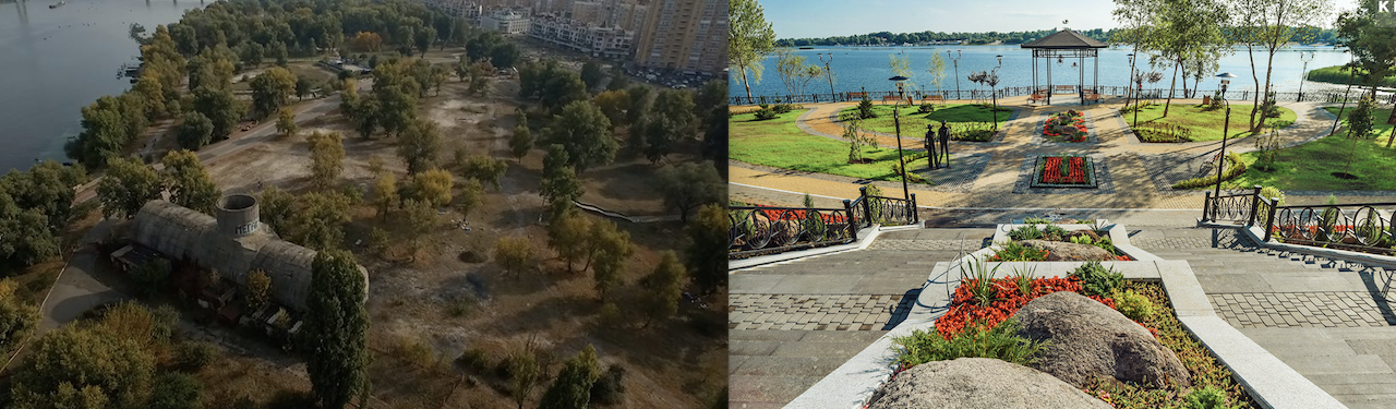 На фото: парк "Наталка" до и после реконструкции. Источник фото: слева – Facebook страница Парк "Наталка"; справа – Киев-Фото