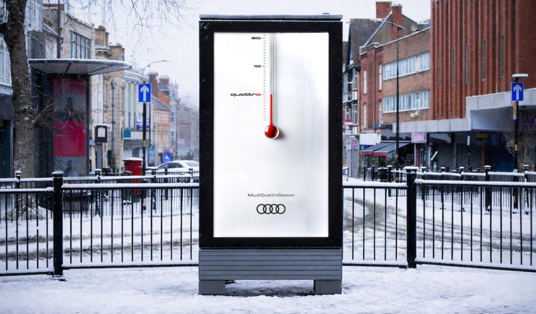 Коли температура опускається нижче нуля, на digital-бордах з’являється термометр і позначка quattro. Таким чином бренд рекламує технологію повного приводу, яка розроблена для кращого контролю автомобіля в умовах зими.
