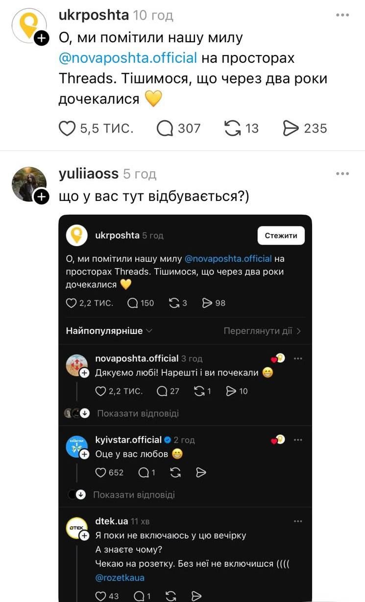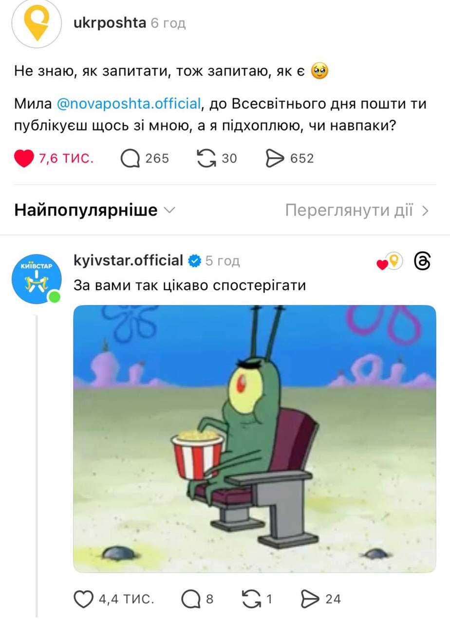 Ці двоє гігантів своїх ніш відрізняються і ведуть акаунти напрочуд гарно. Бренди спілкуються, наче це не корпоративні акаунти великих брендів, а твій друг, якому сумно. Вони коментують пости інших користувачів платформи, вирішують проблеми, реагують на тренди та інфоприводи, звісно, згадують один одного та спілкуються. Наприклад, Uklon у своїх постах відмічає «Нову пошту», «Укрпошту», Київстар та інших, що перетворює платформу на спільний майданчик для публічних обговорень і ситуативних жартів. Така взаємодія створює відчуття «бренд-спільноти» в Threads і робить контент живим, а не відокремленим.
