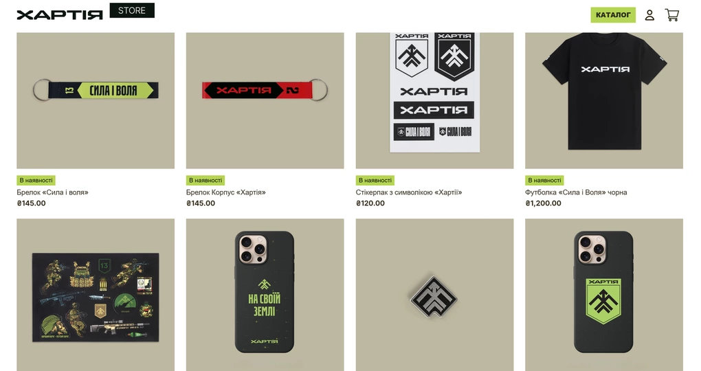 Бригада Нацгвардії України "Хартія" запустила свій онлайн-магазин Khartiia Store. У ньому можна знайти мерч бригади, аксесуари та колаборації з українськими брендами сучасної культури.