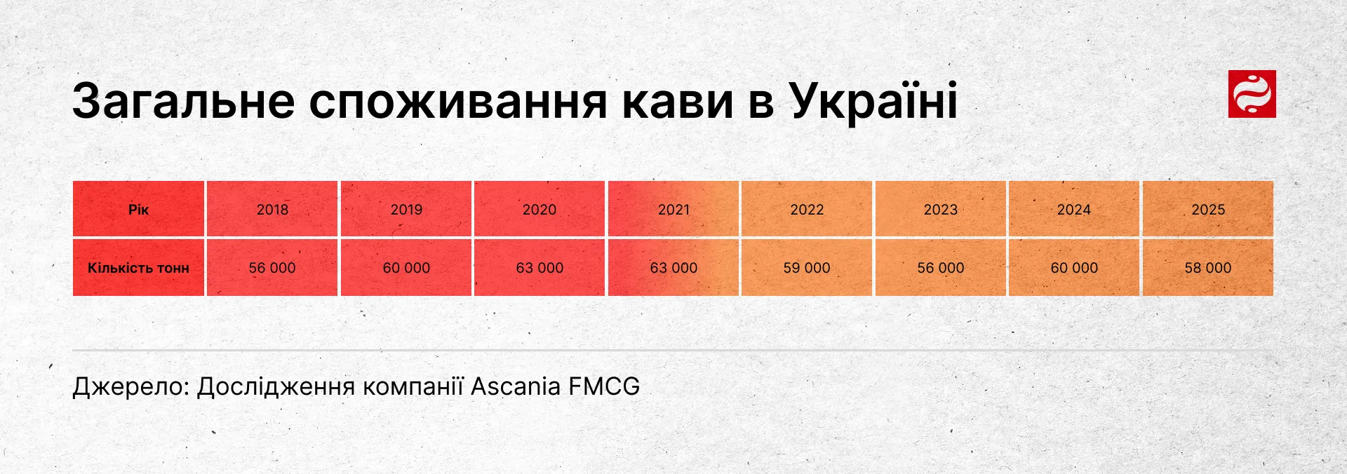 Позаяк ринок кави в Україні за підсумками 2025 року не повернувся до довоєнних показників (українці спожили 58 000 тонн кави у 2025-му проти 63 000 у 2021-му), менше споживання не свідчить про спад. Багато українців виїхало за кордон, однак, споживання кави на душу населення зростає. Це говорить про те, що ті, хто залишився, стали пити більше цього напою.