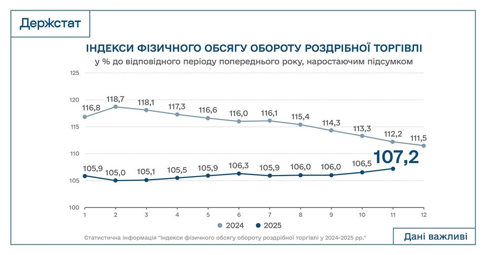 Водночас у листопаді 2025 року динаміка істотно прискорилася: оборот роздрібної торгівлі зріс на 14,1% у річному вимірі. Це майже вдвічі перевищує середньорічний темп зростання.