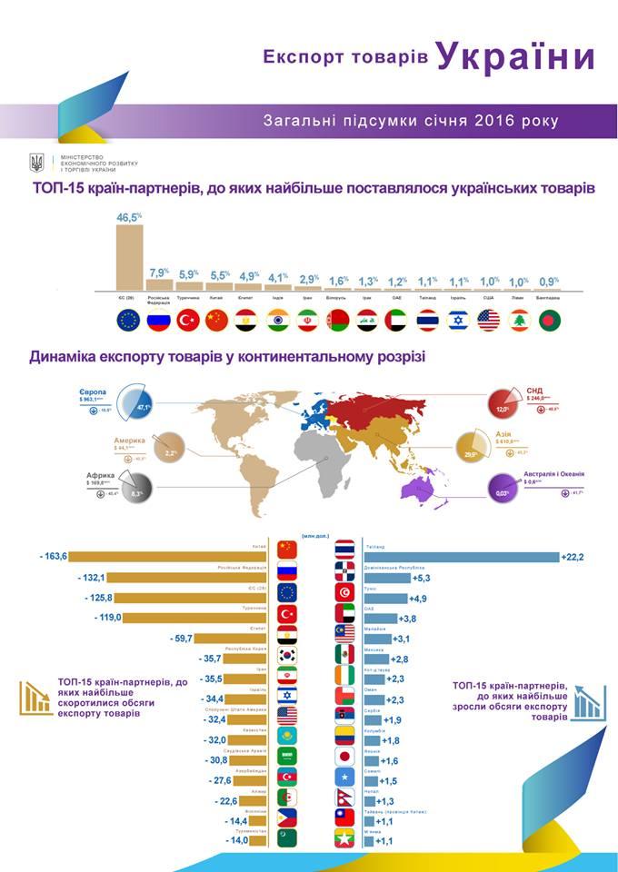 Экспорт товаров из Украины в январе 2016 года по сравнению с аналогичным периодом 2015 года, снизился на 31,9% и составил $2 млрд, а лидером среди экспортных товаров оказалось подсолнечное масло.