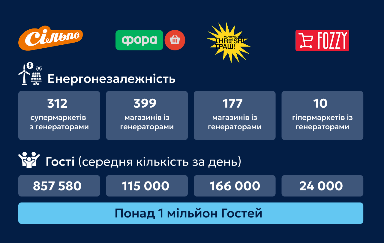 Більшість магазинів забезпечені резервним живленням. Крім того, у 156 супермаркетах "Сільпо" діють "Світальні" — зони, де можна зарядити пристрої, зігрітися, попрацювати або ж просто відпочити.