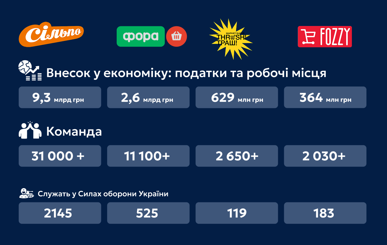Частина команди нині служить у Силах оборони України. Зокрема, 183 співробітники FOZZY, 525 працівників "Фори", 119 — "THRASH! ТРАШ!" та понад 2145 фахівців "Сільпо". Бізнеси системно підтримують колег на службі та створюють умови для їхнього повернення і адаптації після демобілізації.