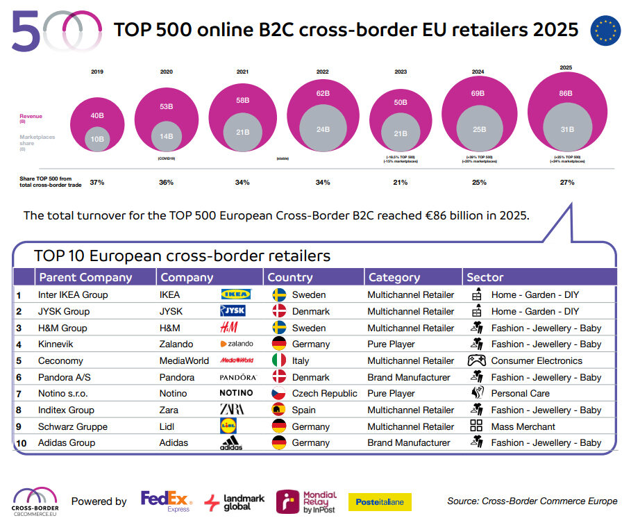 Загальний дохід 500 провідних транскордонних B2C-ритейлерів електронної комерції Європи у 2025 році досяг 86 млрд євро, що дещо менше, ніж роком раніше.